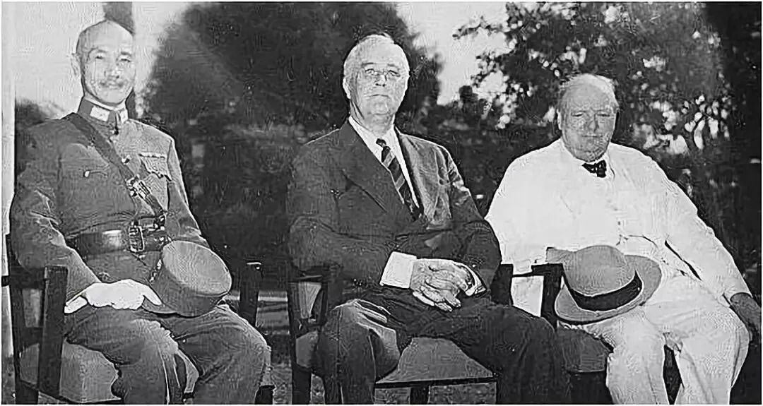 蒋介石与罗斯福和丘吉尔合影的时候,心事重重。