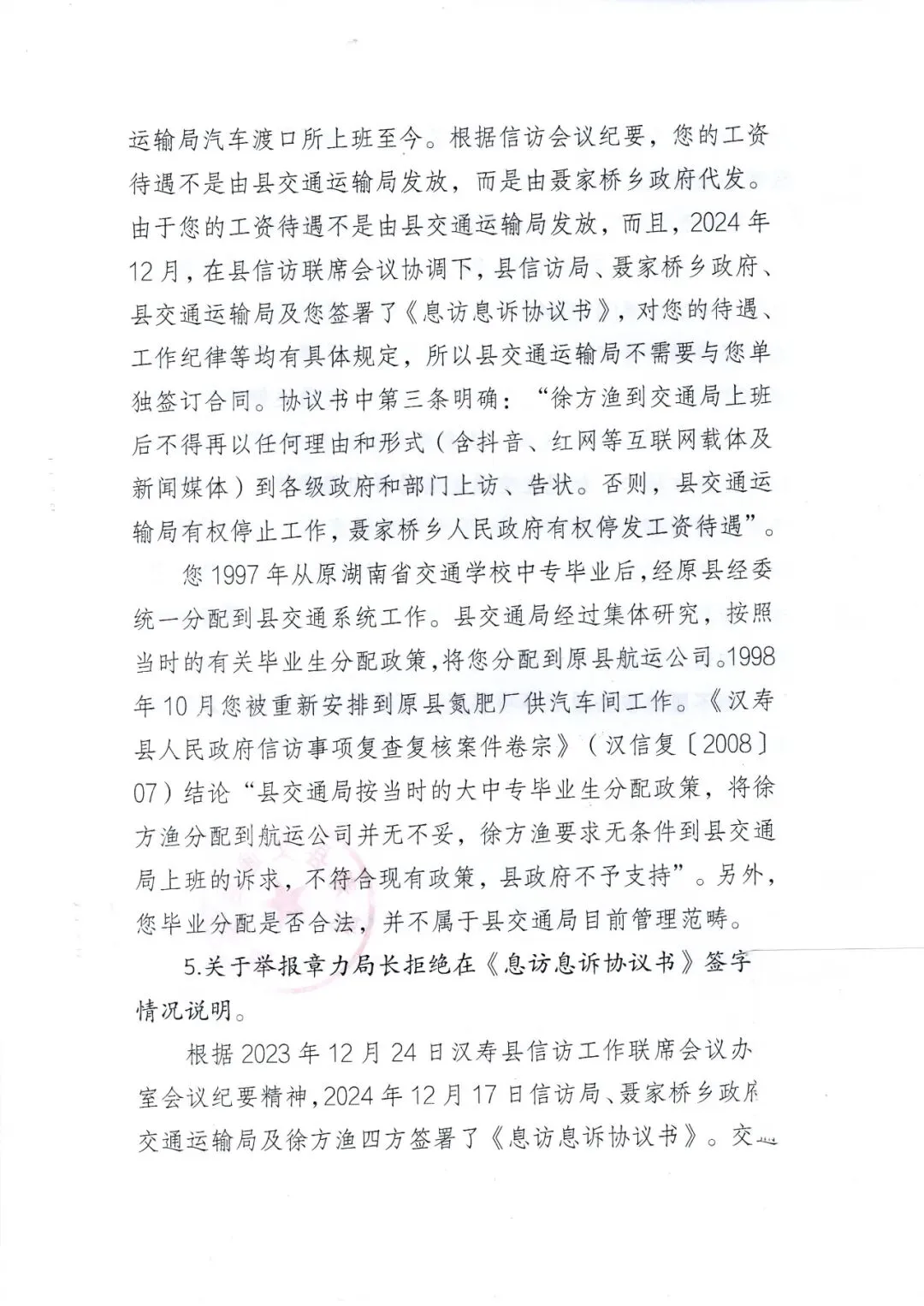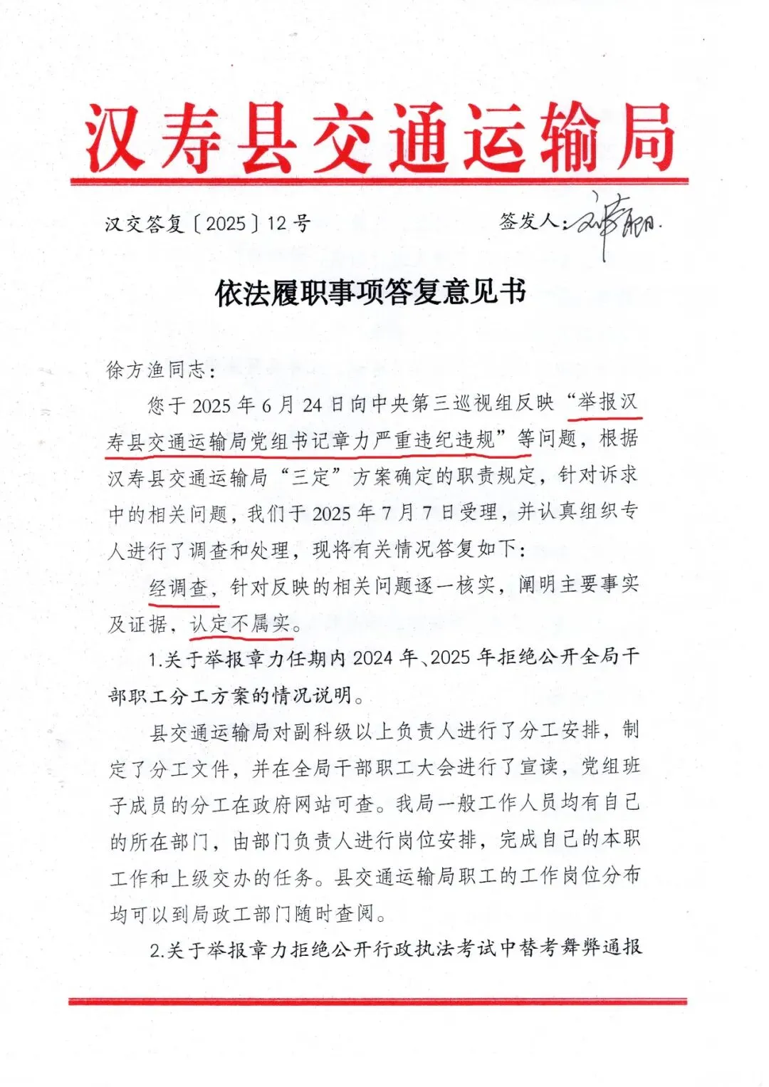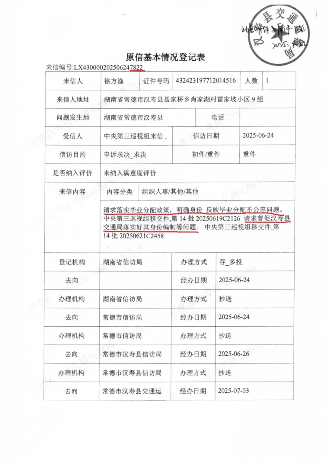 2025年12月18日常德市汉寿县交通运输局受理了国家信访局交办的《请求实质性解决徐方渔毕业分配信访问题,彻底明确徐方渔在汉寿县交通运输局工作的身份和编制》一案,可是至今也没有向我了解情况、收集证据依据材料——虽然我清楚交通运输局知道事实真相,但是真怕交通运输局又如2025年7月7日受理中央第三巡视组交办内容为“请求督促汉寿县交通局落实好其(徐方渔)身份编制等问题”一样,7月7日当天就篡改为“举报汉寿县交通运输局党组书记章某局长严重违纪违规”等问题,且歪曲事实、颠倒黑白作出《汉寿县交通运输局依法履职事项答复意见书》(汉交答复〔2025〕12号)了事——故公开向我们交通运输局,向我们章局长汇报递交一下,放心些。
