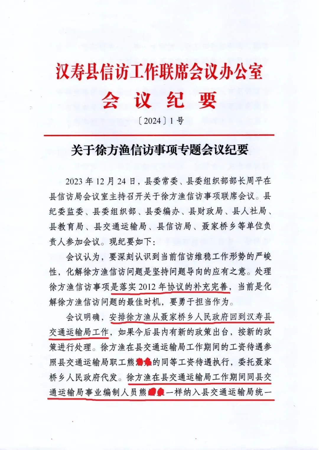 2023年12月24日,汉寿县委、县政府又开会安排徐方渔回到汉寿县交通运输局工作,决定徐方渔的工作待遇参照1997年进入汉寿县交通局工作的熊涌泉执行。有《汉寿县信访工作联席会议办公室关于徐方渔信访事项专题会议纪要》(〔2024〕1号),且写入了四方签字的《息访息诉协议书》。
