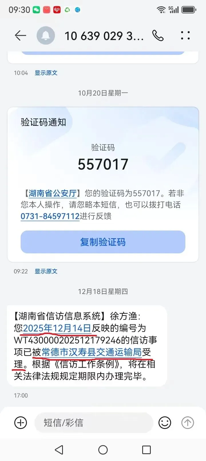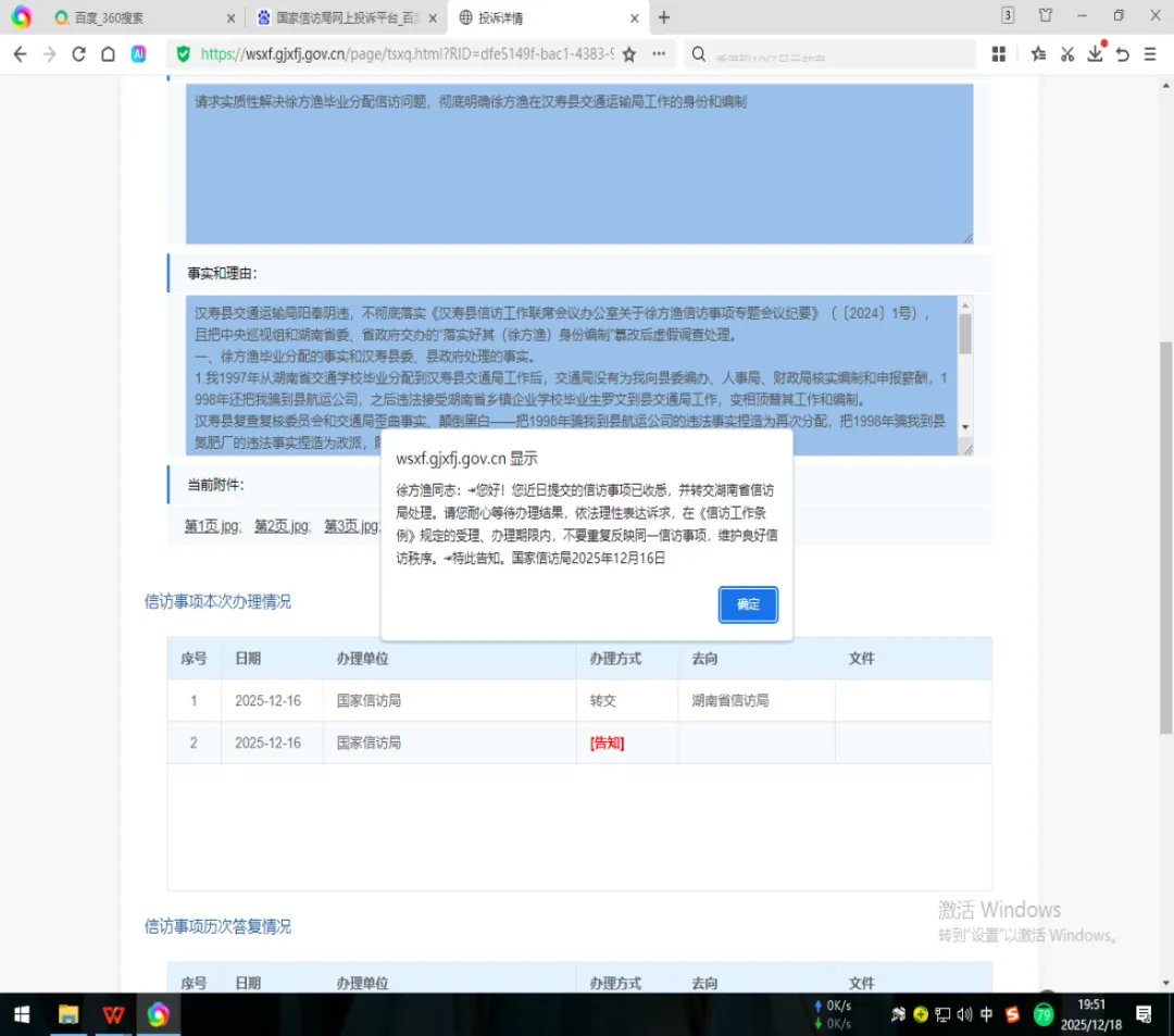 时隔2年半,徐方渔于2025年12月14日晚上21点多向国家信访局递交有关毕业分配的信访事项,国家信访局12月16日告知“转交湖南省信访局处理”,湖南省信访局12月18日告知“被常德市汉寿县交通运输局受理”,12月19日汉寿县交通运输局给我受理告知书。从此,至今了无音讯。