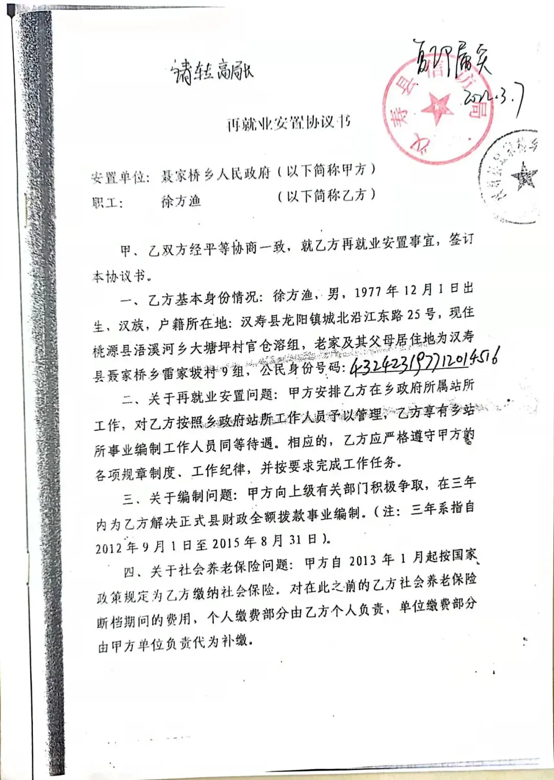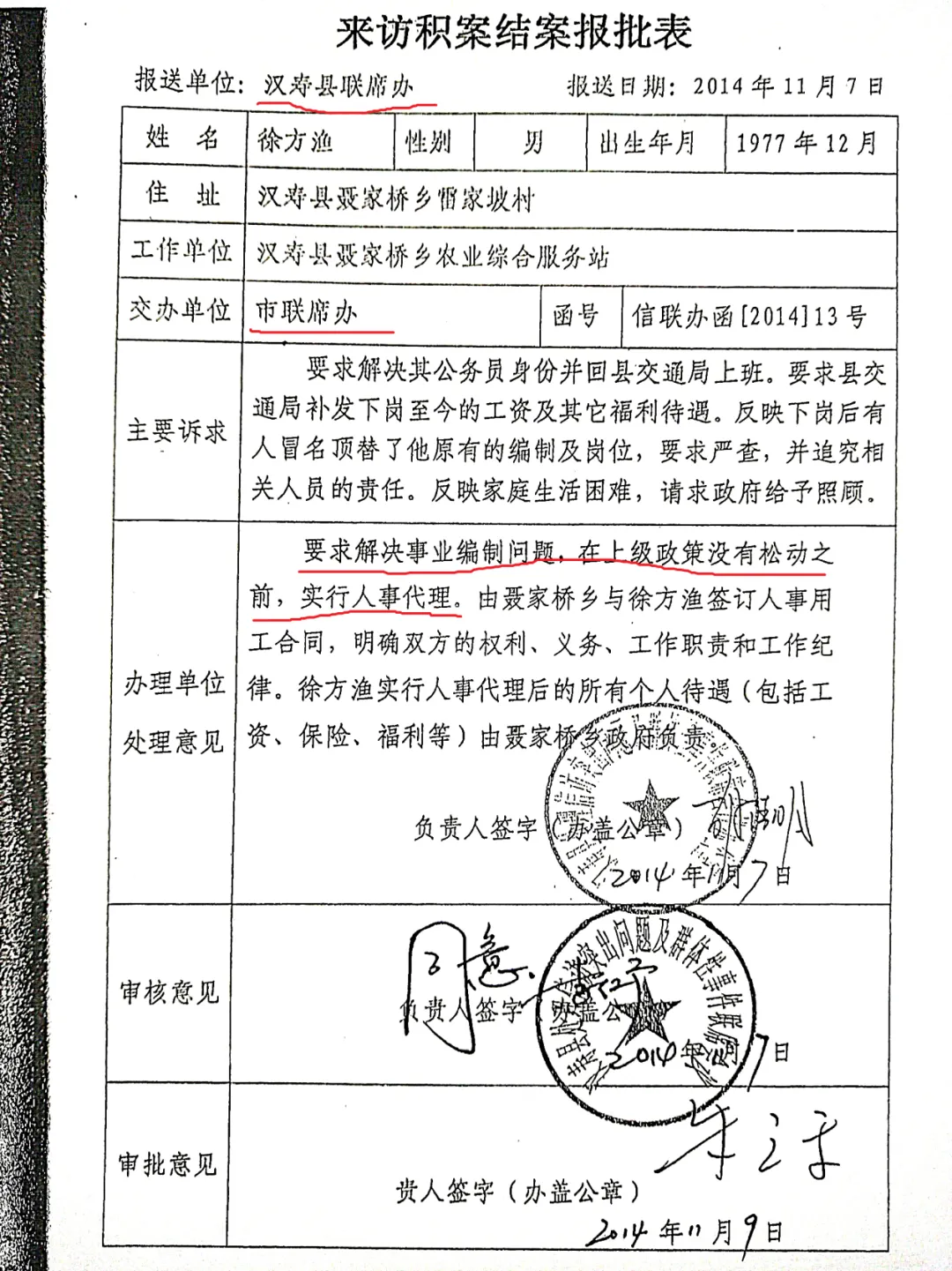 2012年汉寿县委查明徐方渔的毕业分配真相,识破县交通局的欺骗后,作出了让聂家桥乡人民政府和徐方渔签订《再就业安置协议书》的决定,明确“徐享有1997年进乡站所事业编制工作人员同等待遇”“三年内为徐方渔解决正式县财政全额拨款事业编制”。2014年汉寿县委常委会决定(有会议记录)对徐方渔毕业分配事项“特事特办,进人进编”,委托县委原余习琼常委开协调会执行(会议有全程录音录像备案)。由于一些别有用心的领导不作为,仅让聂家桥乡人民政府和徐签订《事业单位聘用合同》了事,没有完全落实和执行县委决定,导致2014年11月汉寿县信访工作联席办向常德市委、市政府只能汇报“徐方渔要求解决事业编制问题,在上级政策没有松动之前,实行人事代理”。