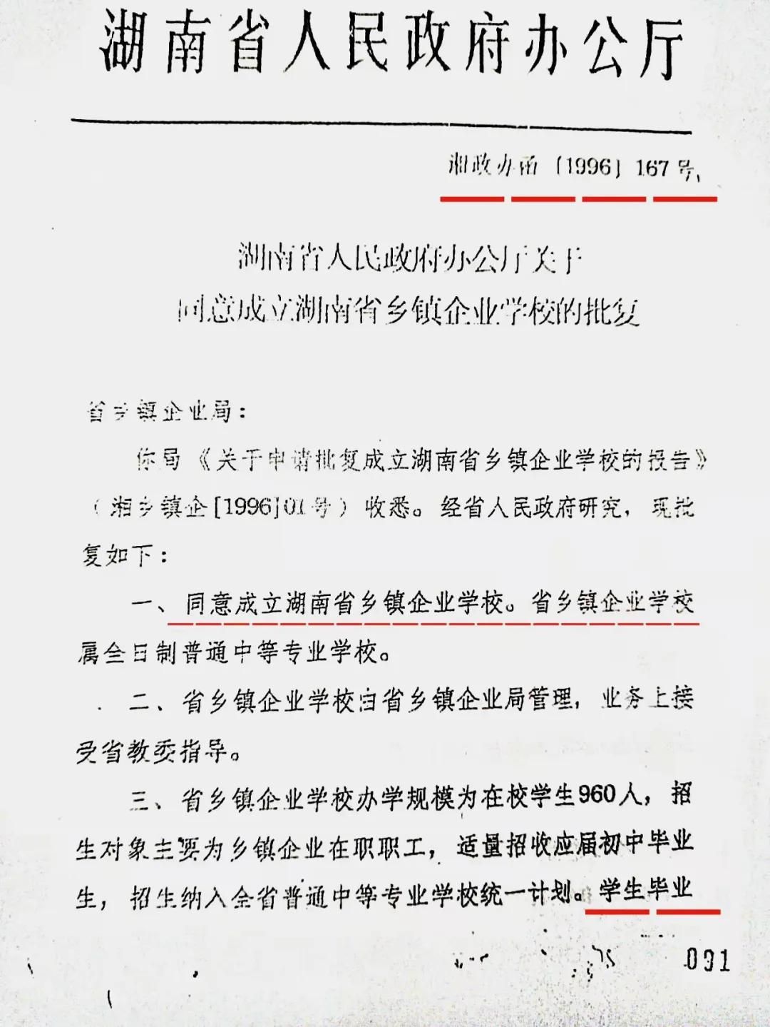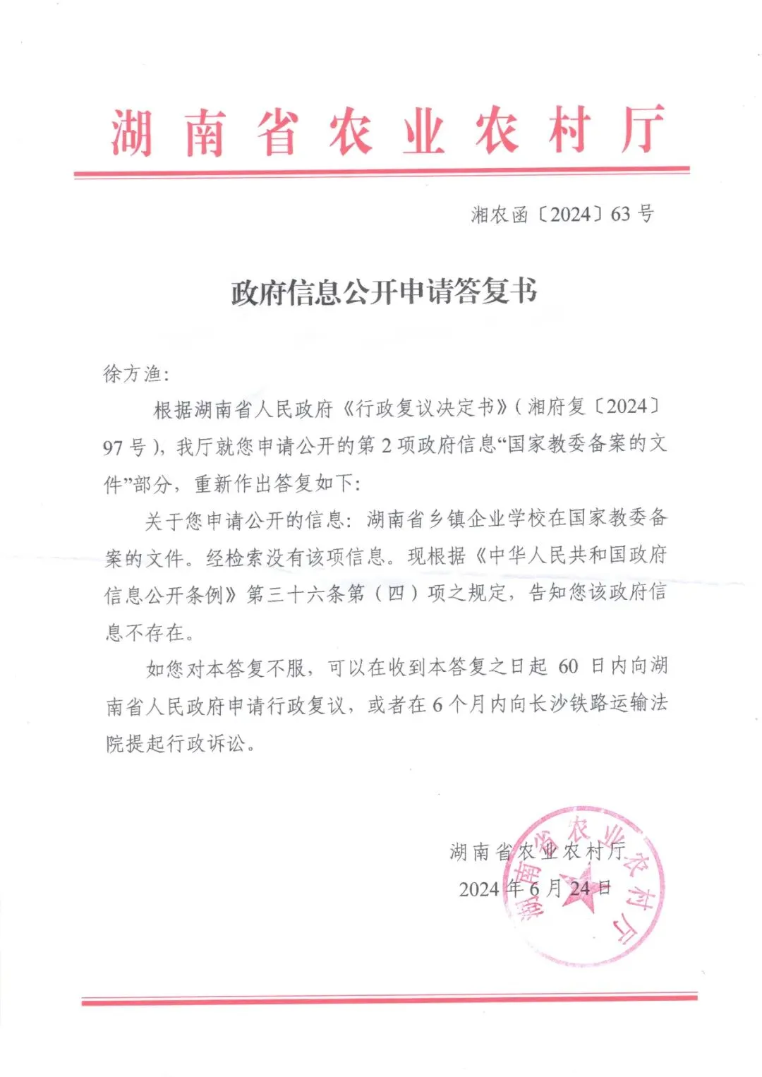 1990年国家教委颁布的《普通高等学校、中等专业学校招生计划管理暂行办法》规定:筹建中的学校不得安排招生。 (3)《湖南省农业农村厅政府信息公开申请答复书》(湘农函〔2024〕63号)明确“湖南省乡镇企业学校在国家教委备案的文件信息不存在”。