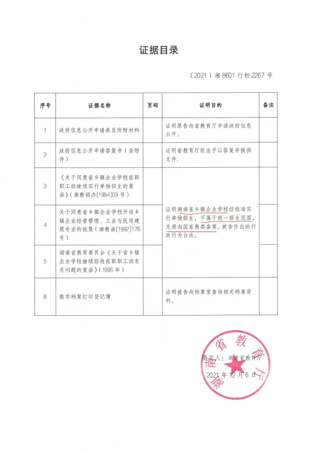 湖南省教育厅在(2021)湘8601行初2267号案中(证据目录、法庭审理笔录等)也认可了:罗文、万文迪不属于统招统分生,是在职职工职业培训性质;湖南省乡镇企业学校成立和招生没有向国家教委备案;湖南省教育厅没有分配罗文、万文迪。
