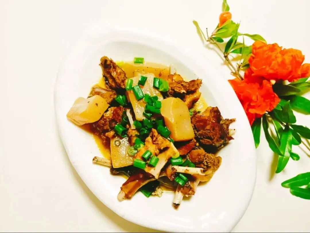 怀鸭炖魔芋,肉末烧冬瓜,清炒红菜苔,排骨海带汤,桃花香米饭