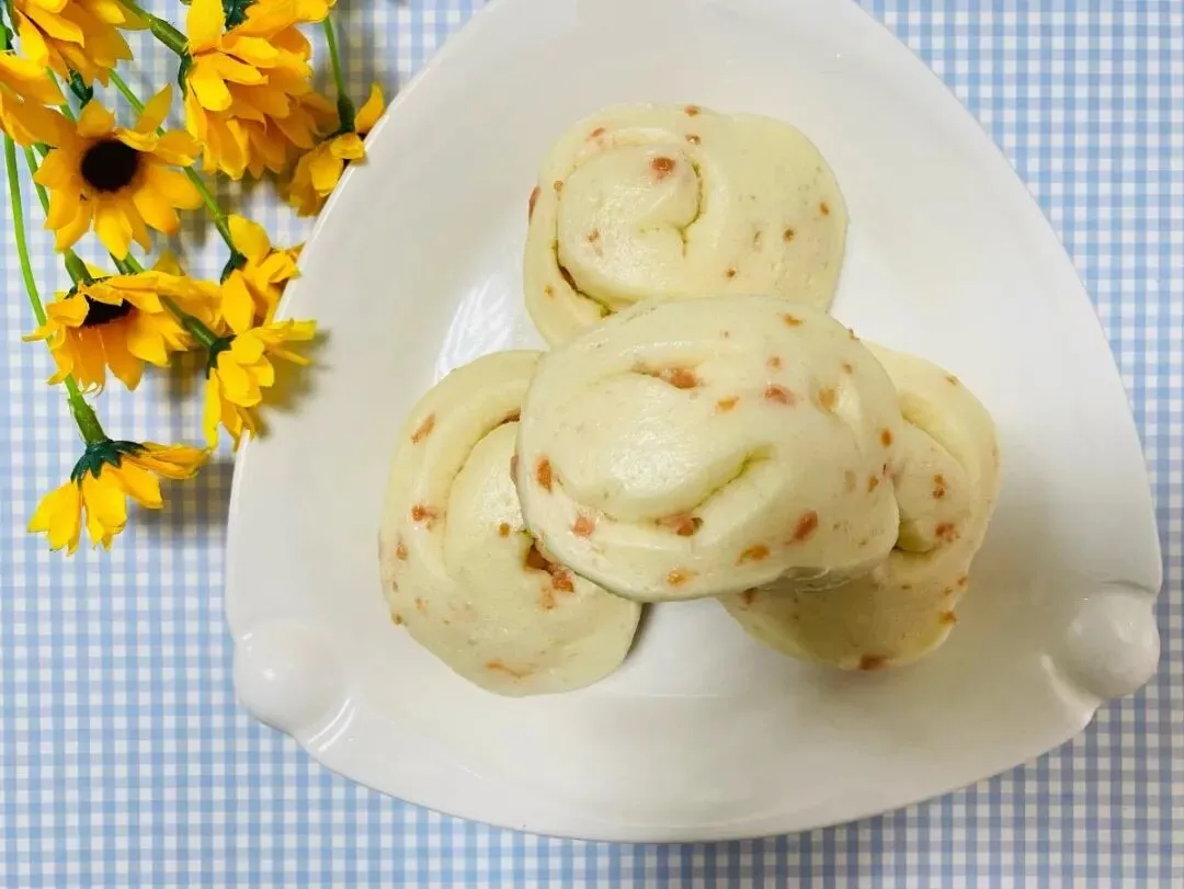 火腿牛角包、肉松小贝、椒盐葱香饼、香蕉芝士派、香甜玉米棒、牛奶、小青瓜、红心火龙果