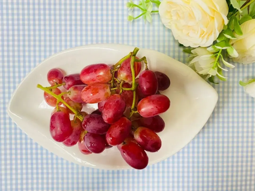 五香火腿卷、青菜瘦肉粥、鸡蛋、无籽红提