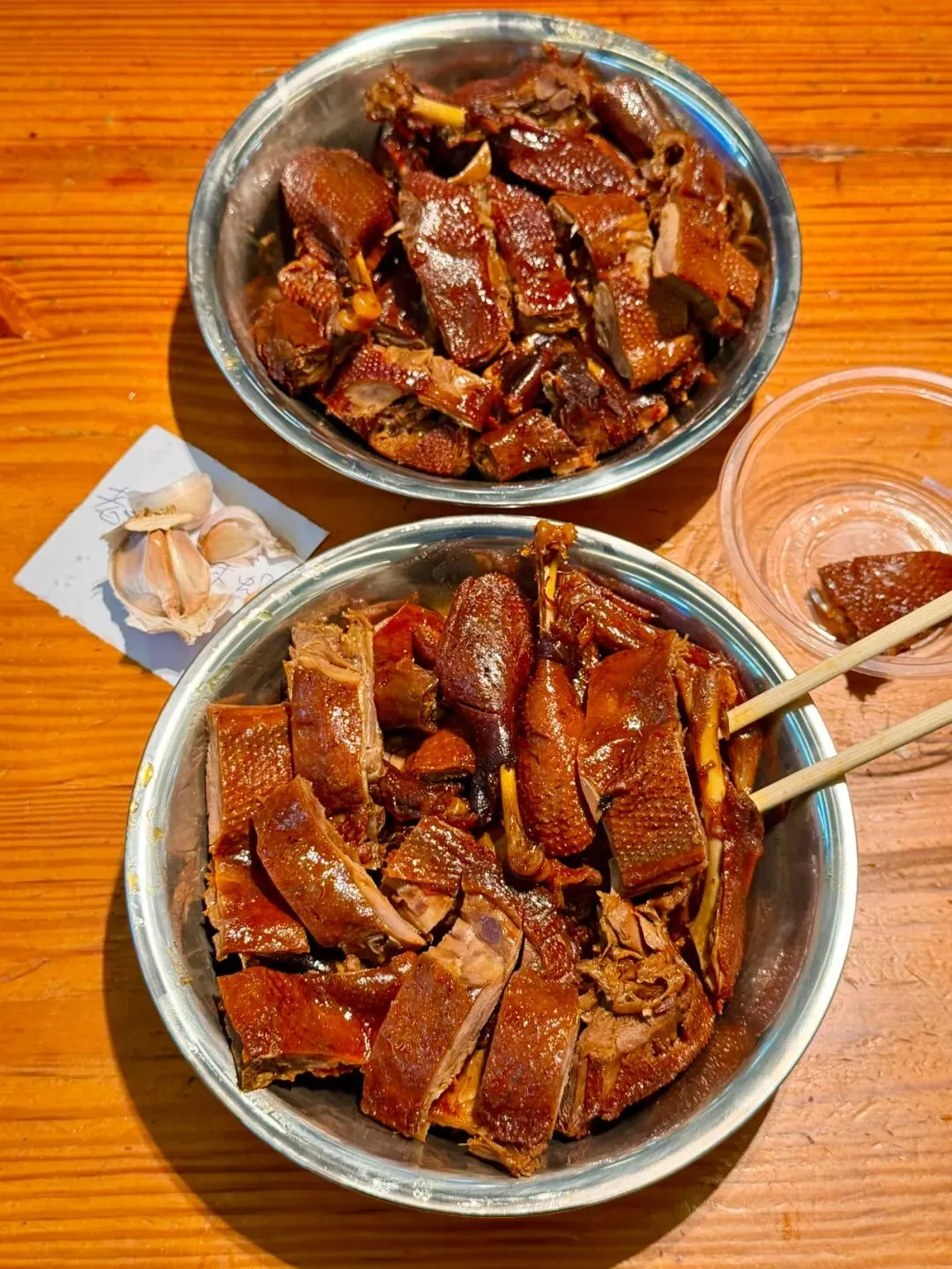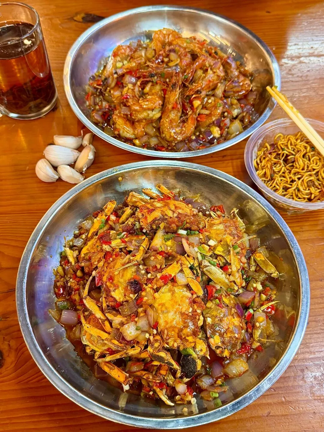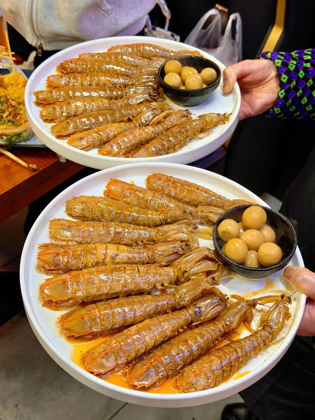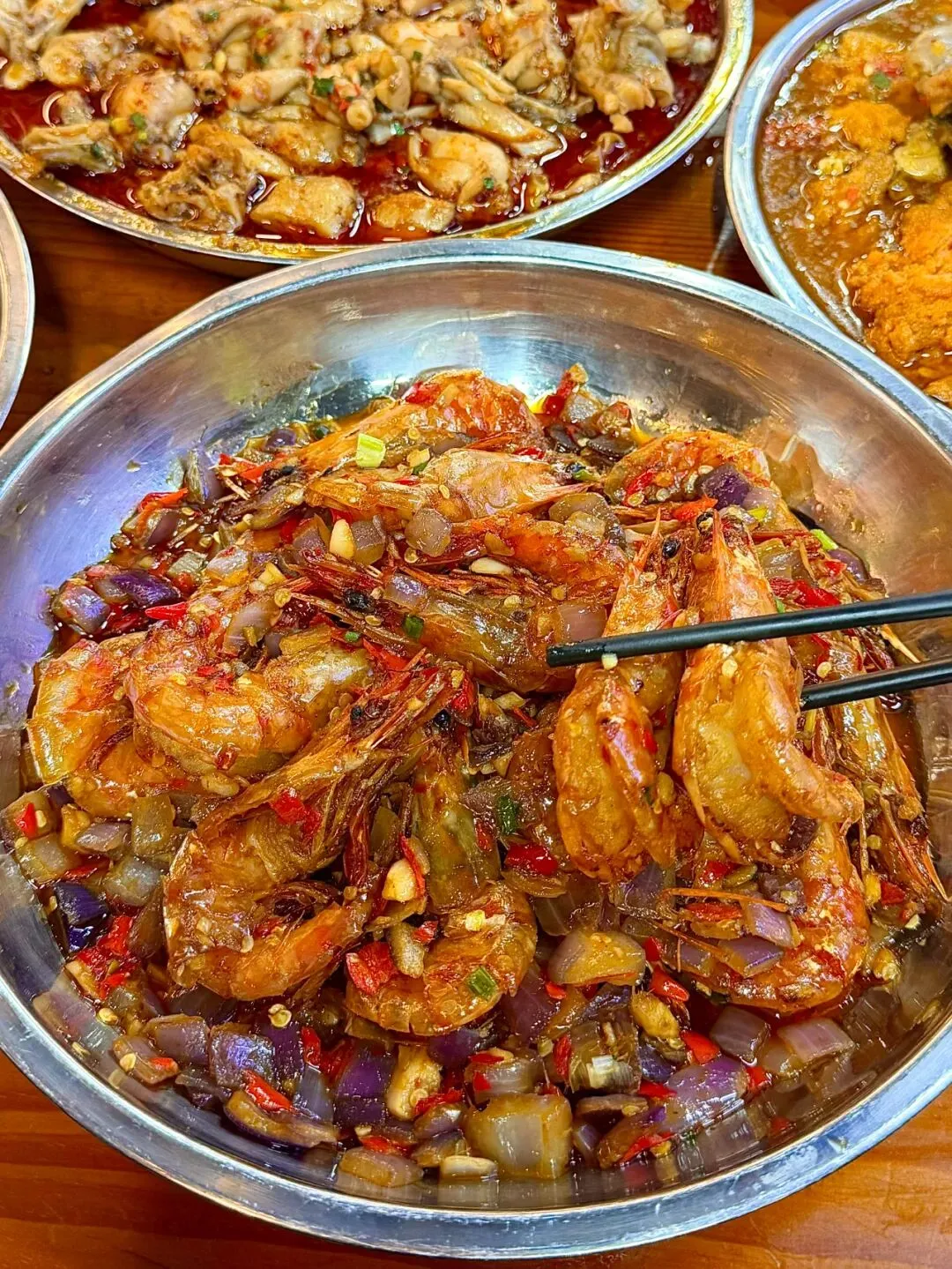 干煸黑虎虾、老卤鸭、香辣扇子骨、纸皮烧麦、现烤的红菜苔…份量好足,