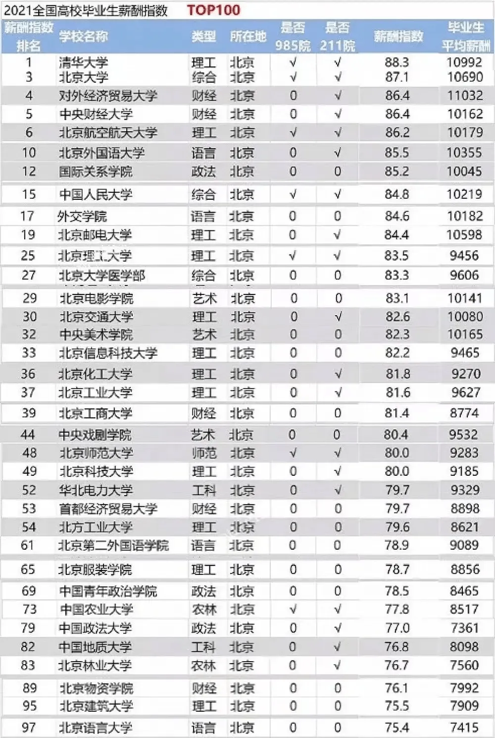 学历就是一张价值凭证,很大程度上决定了你在社会上的资本。中国薪酬网曾公布《2021中国高校毕业生薪酬指数排名top100》,数据显示:
