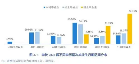 不同学校的毕业生薪资天差地别,就连同一学校不同学历的毕业生薪资差距也很大。某知名大学曾公布其2020届不同学历毕业生的月薪统计图。