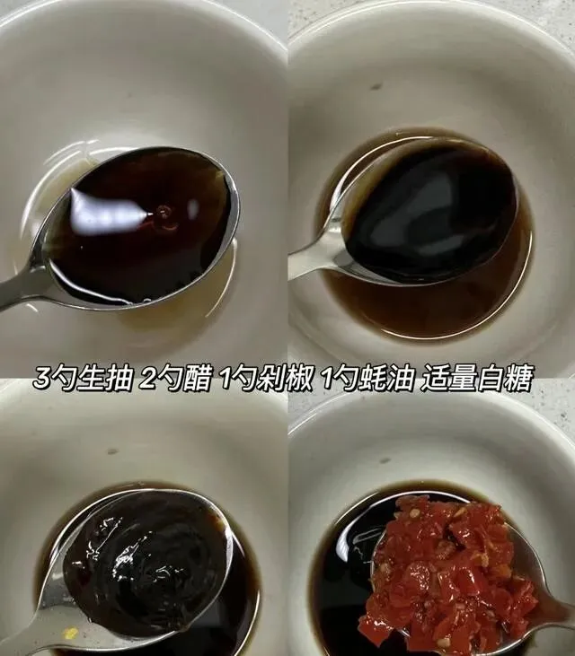 3勺生抽 , 2勺醋 , 1勺剁椒 , 1勺蚝油 , 再来点白糖提鲜 , 搅匀备用就行。