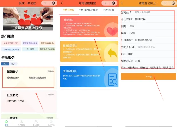 扫描或长按图中二维码进入婚姻登记预约小程序,然后点击【婚姻登记预约】—【结婚预约】—填写信息点击【下一步】—选择登记机关—选择日期时间段—预约完成