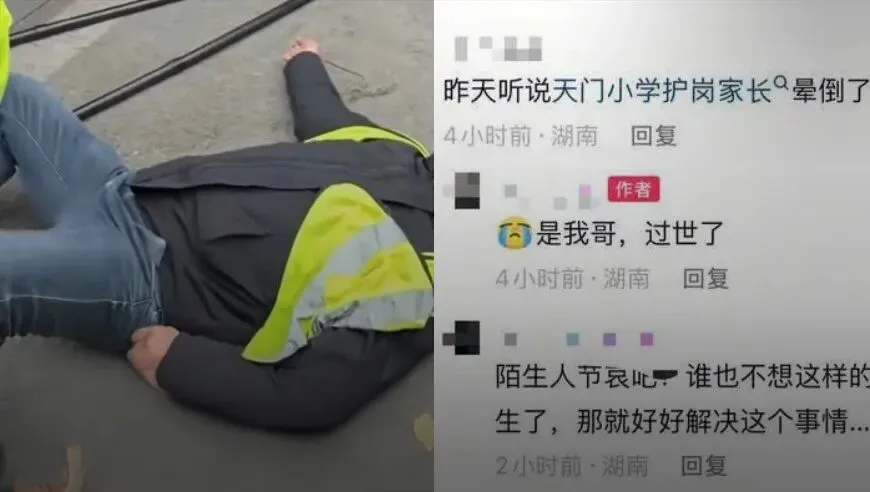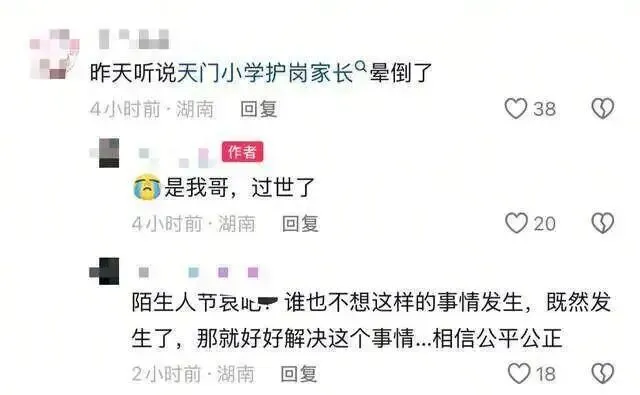 记者注意到,有自称倒地男子妹妹的网友说,倒地男子已离世,年龄45岁,她正连夜赶回去。评论区中,有网友提及天门小学护学岗有家长倒地一事,该网友回复称“是我哥,过世了”。