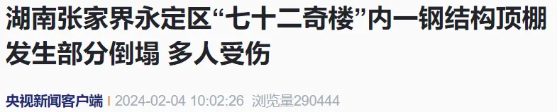 2024年2月3日21时许,湖南省张家界市永定区“七十二奇楼”内一钢结构顶棚发生部分倒塌,造成多人受伤。具体伤亡情况和事故原因正在进一步核查中。