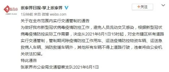 @张家界日报-掌上张家界 微博8月1日消息,张家界市公安局交通警察支队今日发布通告指出,为做好张家界市新型冠状病毒疫情防控工作,避免人员流动交叉感染,根据新型冠状病毒疫情防控实际工作需要,决定从8月1日15时起 ,对全市辖区所有道路实行交通管制,管制期间除疫情防控工作用车、运送疫情防控物资车辆、运送急救病人车辆、消防救援车辆外,其他所有车辆不得上道路行驶,违者将由公安机关依法扣留。