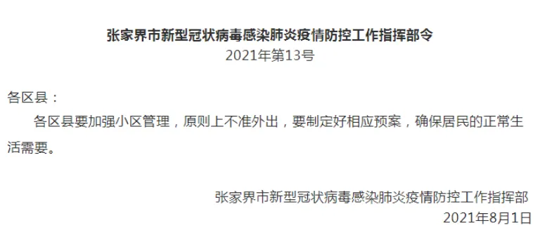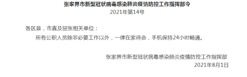 8月1日,张家界市发布新型冠状病毒感染肺炎疫情防控工作指挥部令第13号、第14号,全文如下:张家界市新型冠状病毒感染肺炎疫情防控工作指挥部令