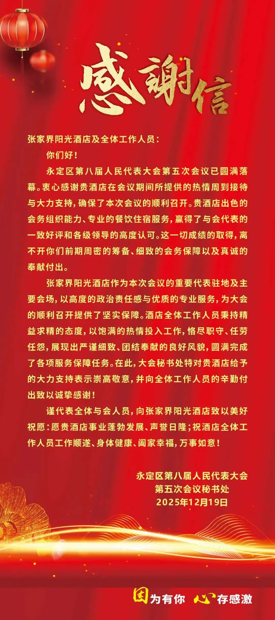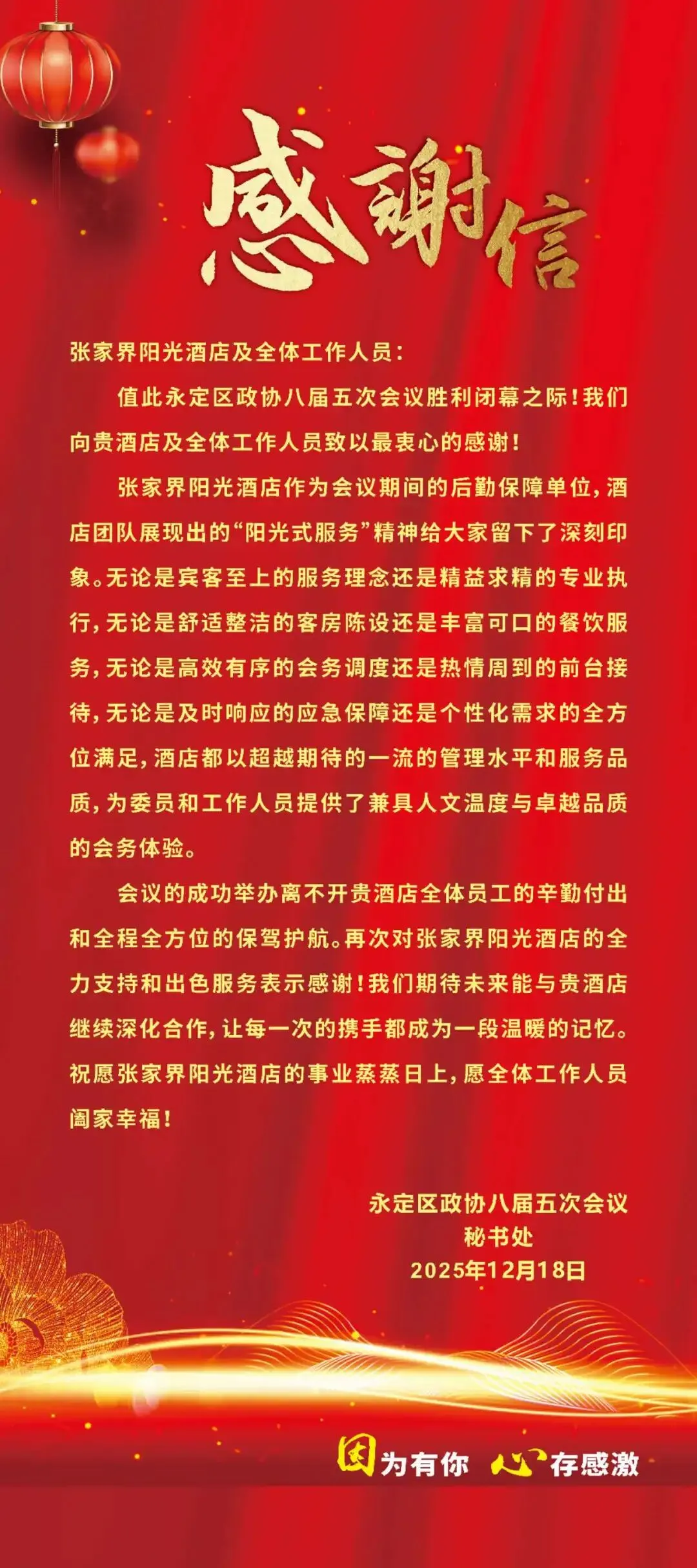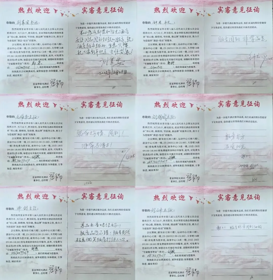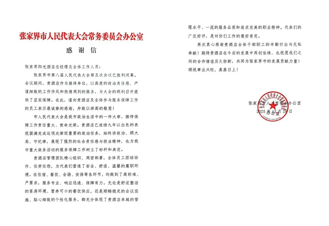 会议期间,酒店累计收到代表、委员亲笔书写的表扬信与感谢信共66封,信中对酒店的特色菜品、高效响应、个性化安排及员工专业素养等给予了广泛好评。会后,大会会务组亦专函致谢,对酒店全体员工奋发向上的精神面貌、文明规范的服务礼仪、严谨细致的工作作风以及精益求精的专业素养提出了高度赞扬。这份历时九载、历久弥坚的信任与认可,是对张家界阳光酒店长期深耕政务接待领域、不断锤炼专业团队、深厚积淀服务文化的最佳褒奖与永恒动力。