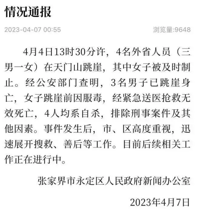 2023年4月4日4名青年在湖南张家界天门山景区跳崖,消息曝出,全网轰动。4月7日,张家界市永定区人民政府新闻办公室发布通告:4月4日13时30分许,4名外省人员(三男一女)在天门山跳崖,其中女子被及时制止。经公安部门查明,3名男子已跳崖身亡,女子跳崖前因服毒,经紧急送医抢救无效死亡,4人均系自杀,排除刑事案件及其他因素。