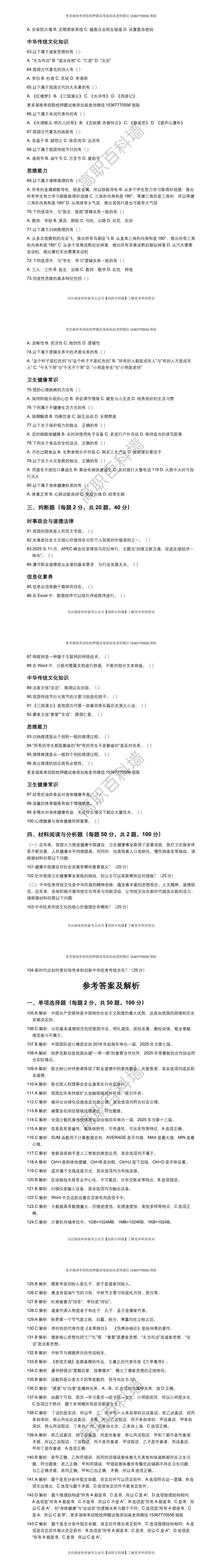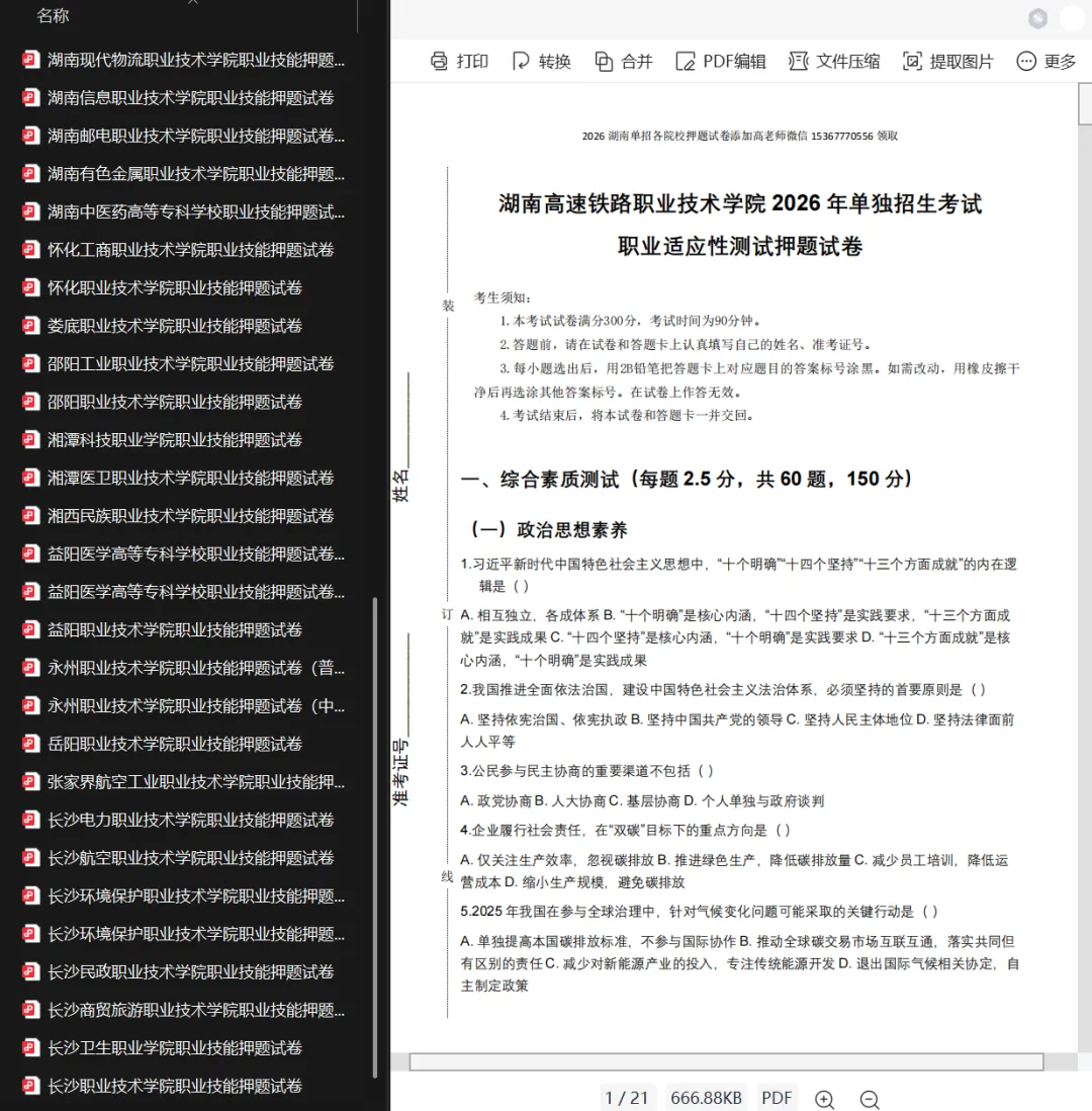 2026湖南省各院校单招押题试卷免费领取