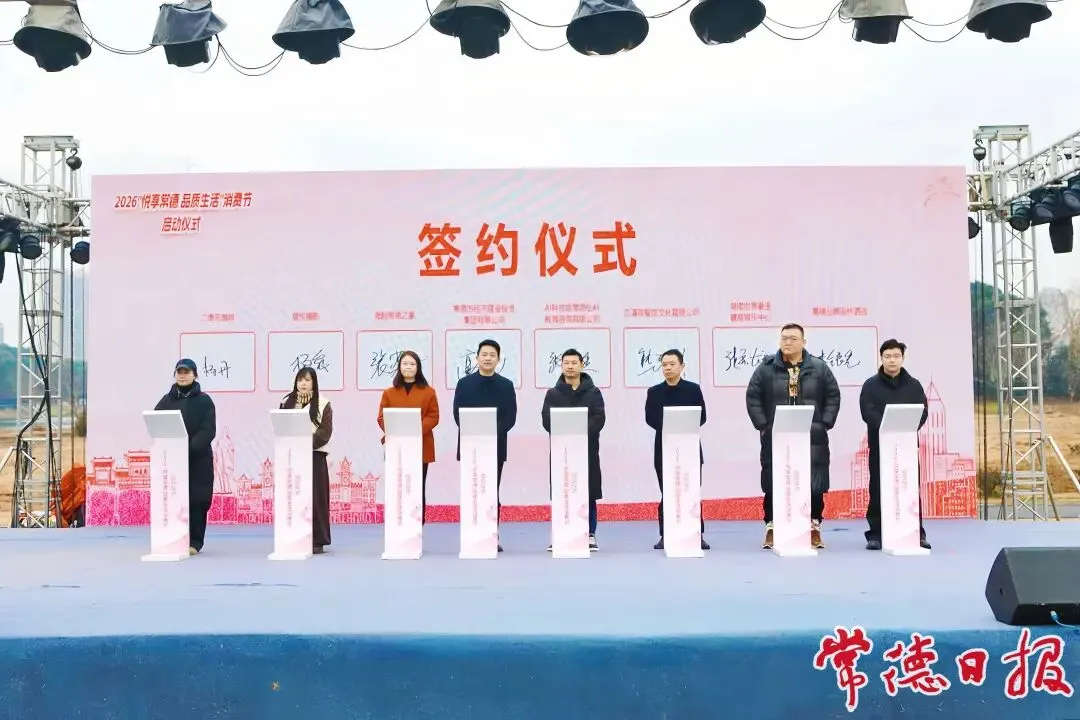仪式现场,市委常委、市委宣传部部长黎军锋,市委常委、市委秘书长黄旭峰分别为中华老字号企业、新增湖南老字号企业授牌。4家企业举行新品首发仪式,彰显了我市发展首发经济的显著成效。市经投集团与7家入驻商户签约,以招商实效助推河街业态提质扩容。现场还发布了2026常德十大促消费活动,这些活动贯穿全年、覆盖全域、惠及全民,深度融合赛事经济、文化旅游等多元业态,推动消费领域“新业态新模式新场景”迭代升级,持续释放消费新活力。