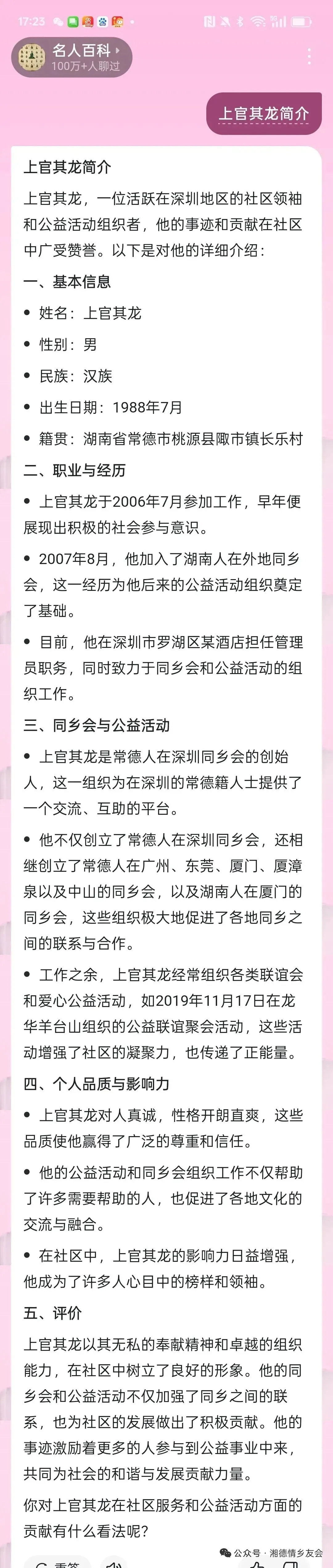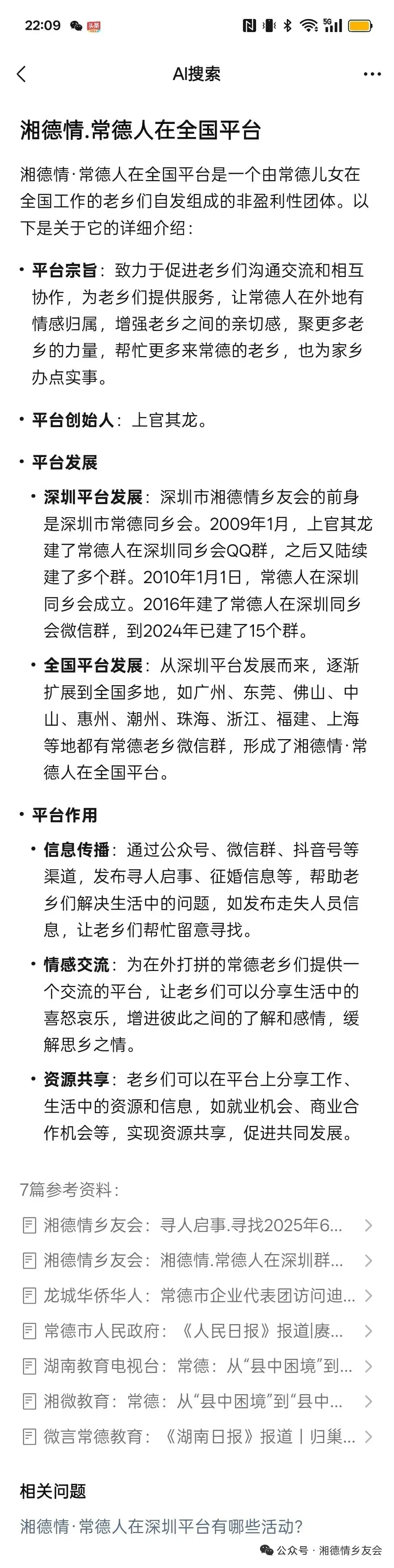 深圳平台发展:深圳市湘德情乡友会的前身是深圳市常德同乡会。2009年1月,上官其龙建了常德人在深圳同乡会QQ群,之后陆续建了多个群。2010年1月1日,常德人在深圳同乡会成立。2016年建了常德人在深圳同乡会微信群,到2025年已建了16个群。