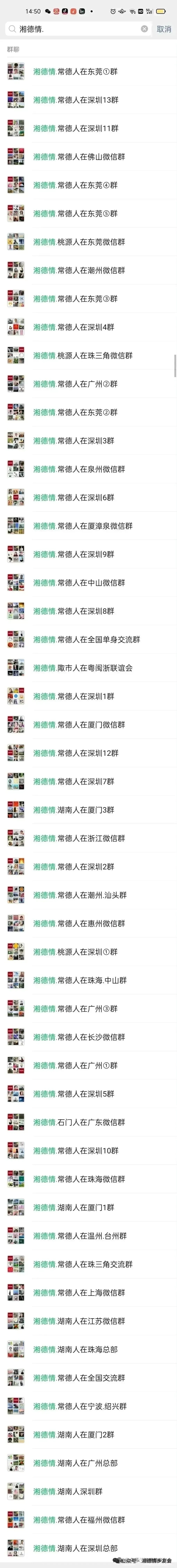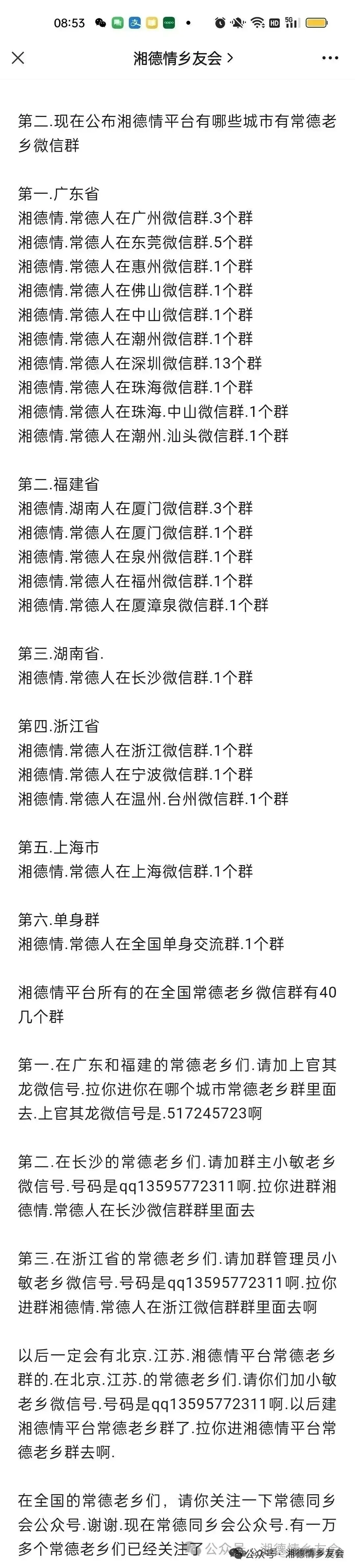 全国平台发展:从厦门、深圳平台发展而来,逐渐扩展到全国多地,如广州、东莞、佛山、中山、惠州、潮州、珠海、江门、浙江、台州、温州、福建、福州、泉州、厦门、漳州、江苏、长沙、上海等地都有常德老乡微信群,到2025年.年底在全国的常德老乡微信群一共有快80个群,形成了湘德情.常德人在全国平台。
