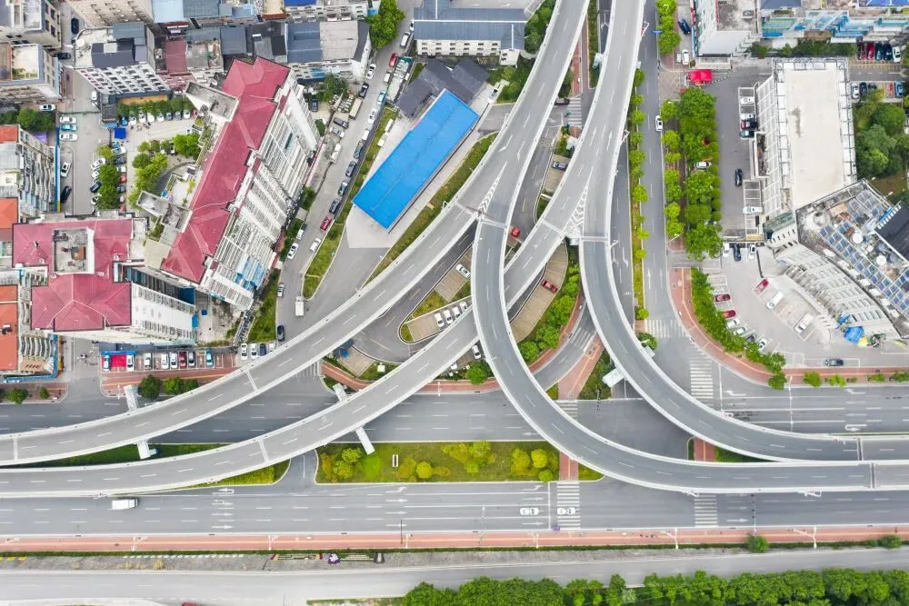 ▲8月7日,张家界市永定区大庸路和大河路交汇处的立交桥,道路上车辆稀少(无人机照片)。新华社记者 陈思汗 摄