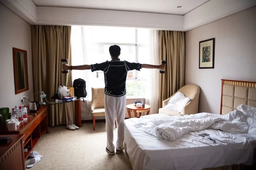 ▲8月8日,在张家界市武陵源区青和锦江国际酒店,上海滞留游客张毛弟在房间内用哑铃健身。新华社记者 陈思汗 摄
