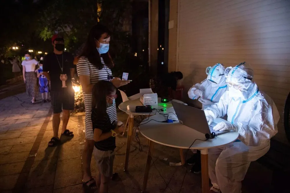 ▲8月4日,在张家界市永定区山水印象小区,医务人员在核酸取样检测前登记居民信息。新华社记者 陈思汗 摄