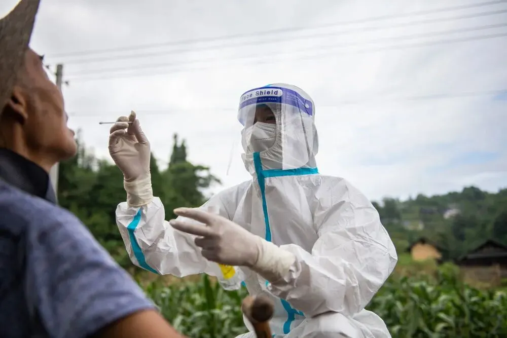 ▲8月12日,在张家界市永定区沅古坪镇柏杨坪村,医务人员罗进武在给村民做核酸检测取样。新华社记者 陈思汗 摄