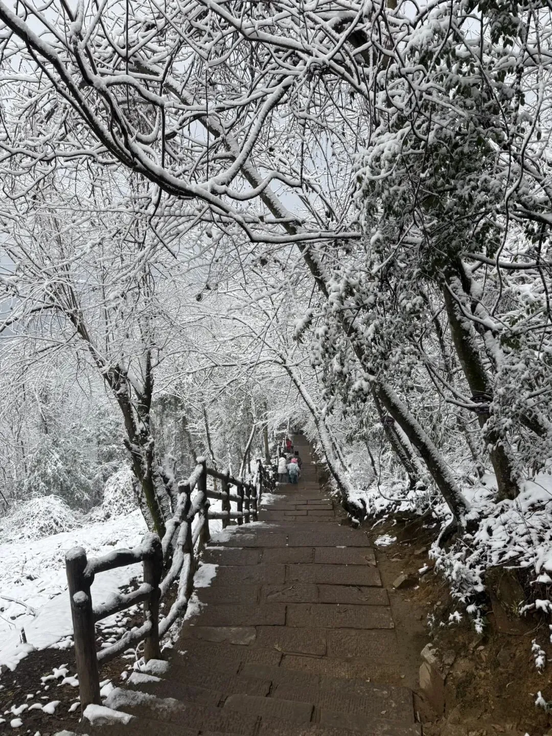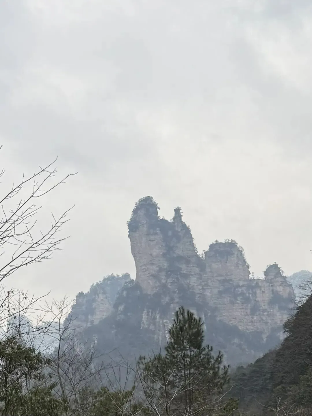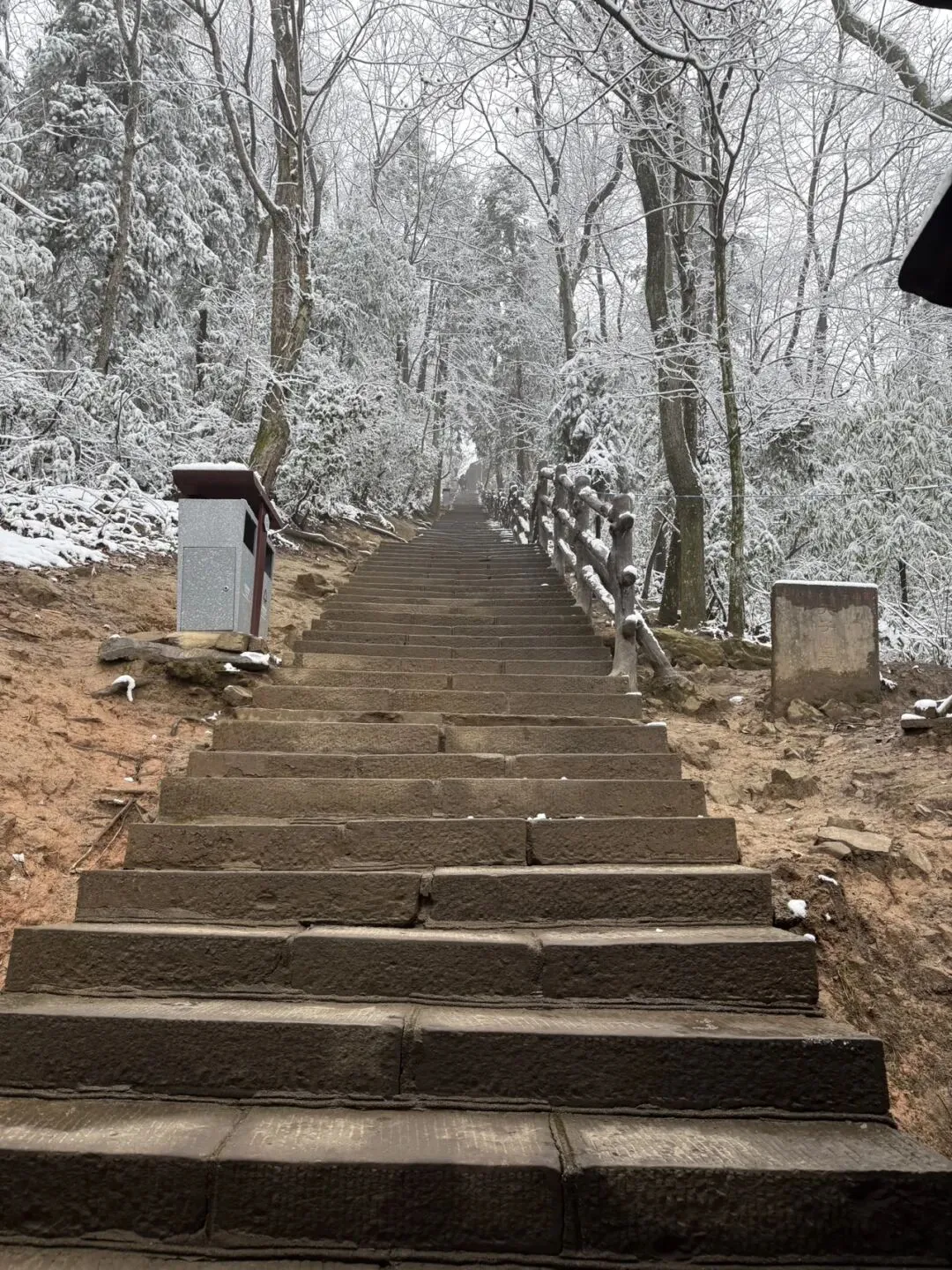 由于攻略做的不仔细,一开始我还妄想从天子山走到十里画廊,又被酒店小姐姐提醒我需要徒步走四个小时,看着刚爬下来的上千个台阶,一咬牙又爬了回去,今天属实有点对不起我的膝盖,索道和观光车节约的体力,全在这讨回来了。因为大多数人不会走这条路,这条路异常安静。能听到的时候落雪声、走路声、心脏的砰砰声、自己的大口喘气声。绝对的安静让声音被放大,走在这条路上很容易进入冥想的心流。