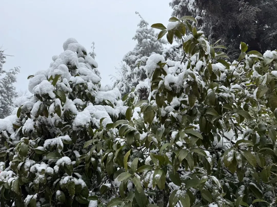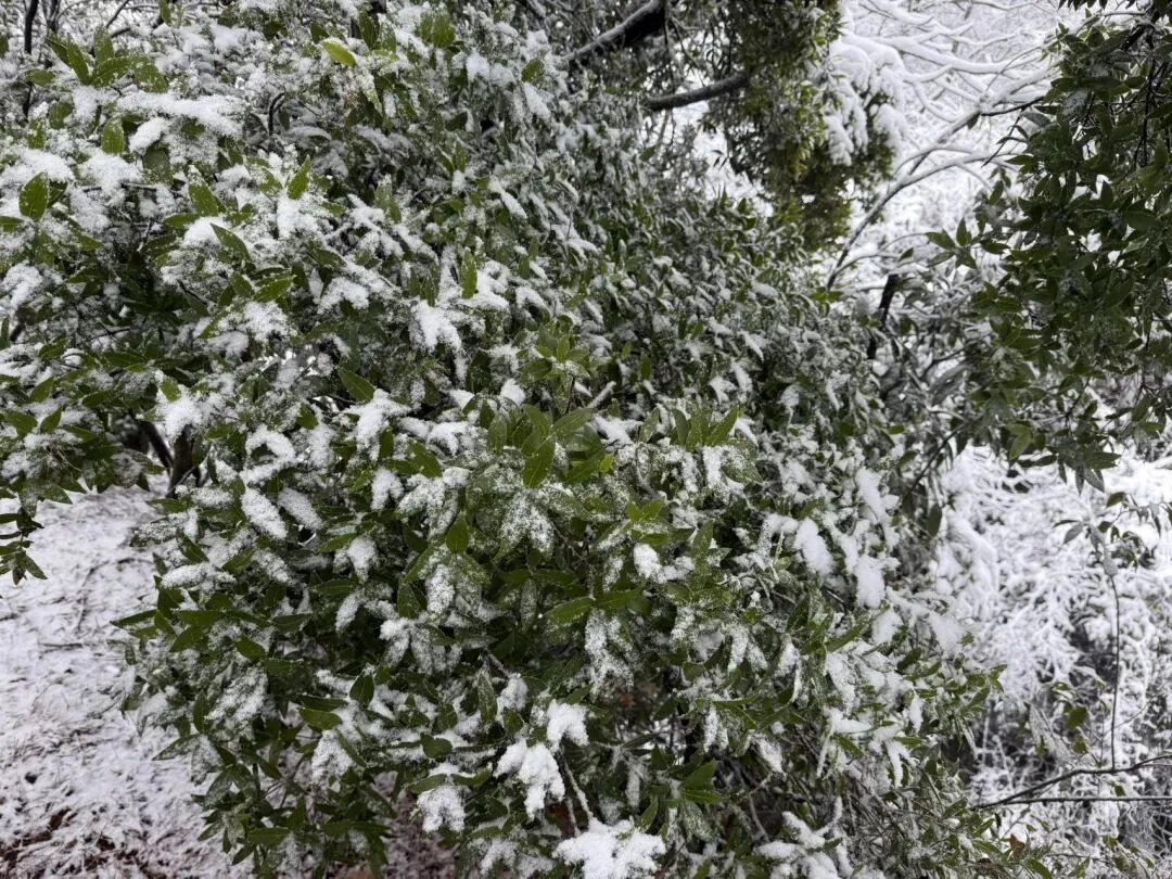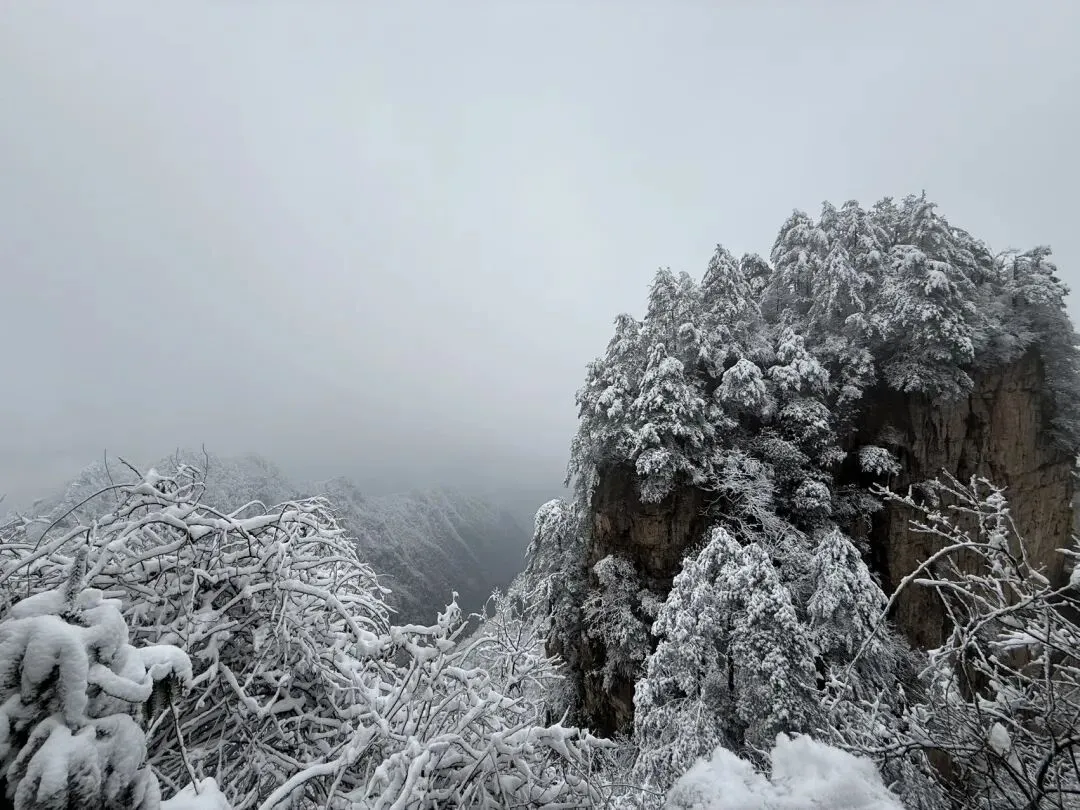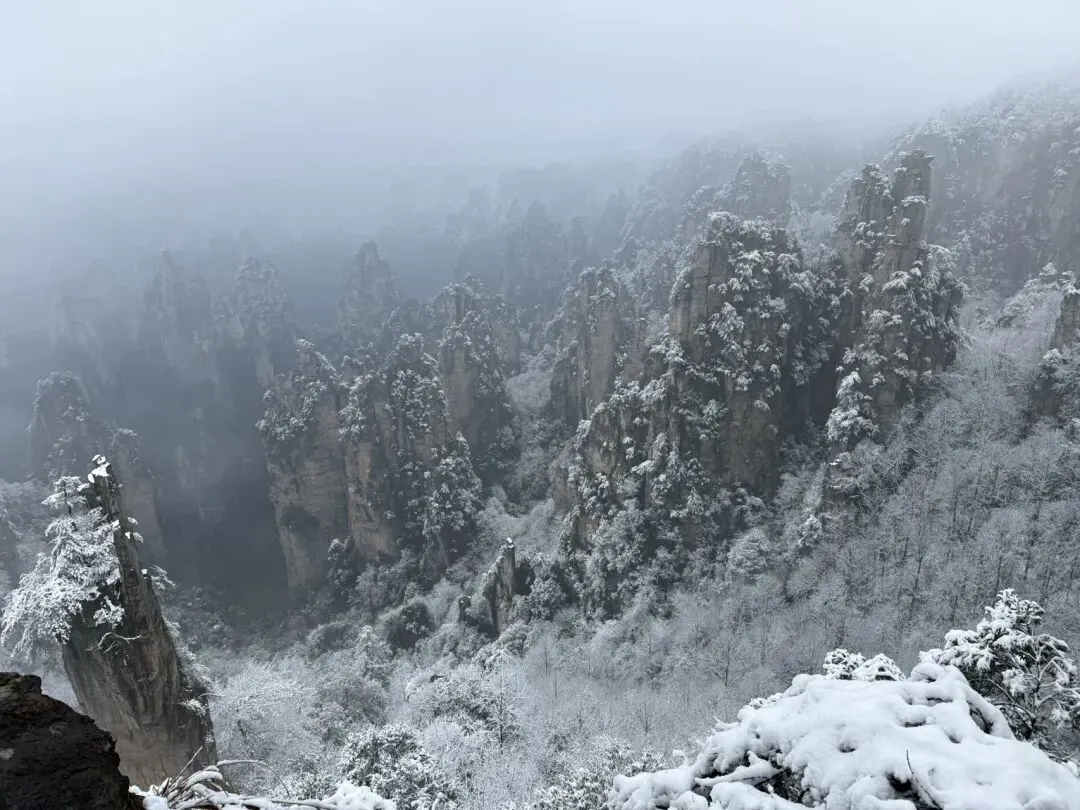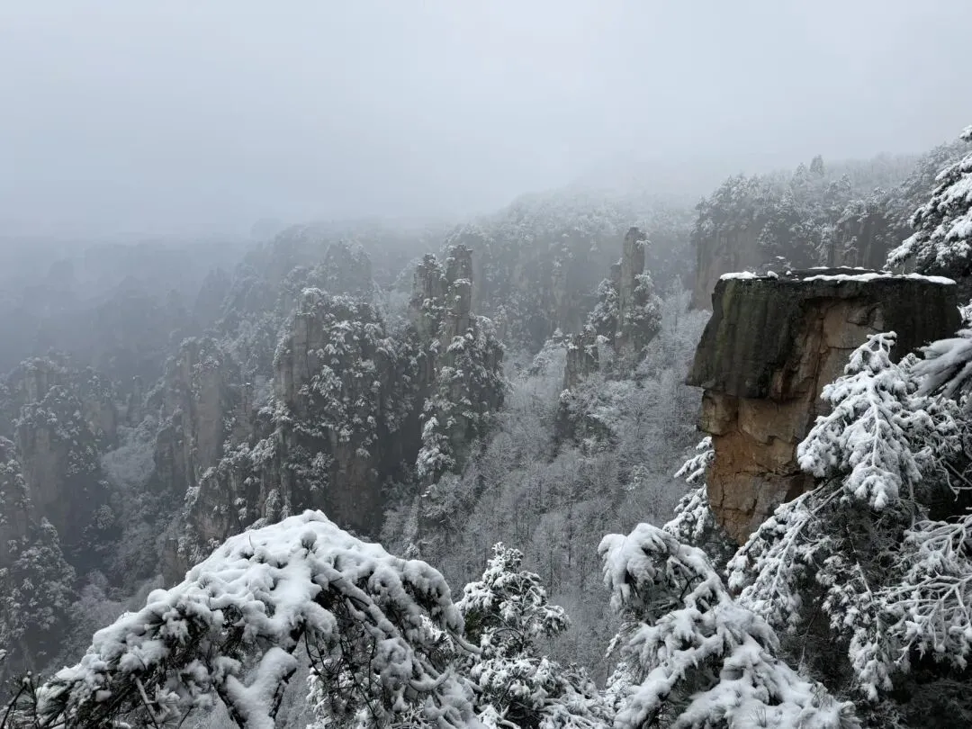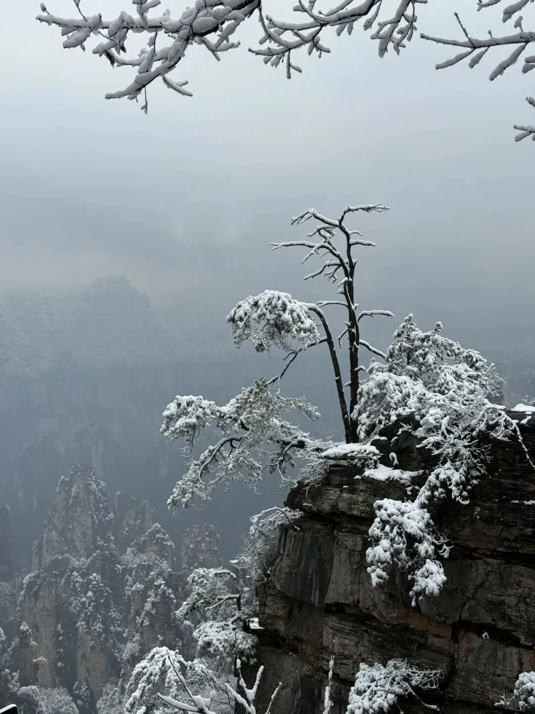 天门山上,远处是雾气,近处是雪尘,远远近近都朦朦胧胧看不清楚。同样是雪,东北的雪和张家界的雪是不一样的。东北的雪是大地的伴娘,雪在东北仿佛像是孩子回到了母亲的怀抱,东北这片土地包容着万物,也包容着雪。吉林的雾凇让人觉得仿佛雪和松枝似乎就该如此依偎。张家界的雪不是,张家界的雪好像是凑热闹不嫌事大的看客,石头和大地较着劲,雪和松柏较着劲。你在这片压我一头,我定要在别处向上刺出三分。这里的冬天不是一片素白,而这块石块裸露,那边叶片舒展,雪好像在和石头、树叶在玩涂鸦游戏,看谁能占领更多地盘。