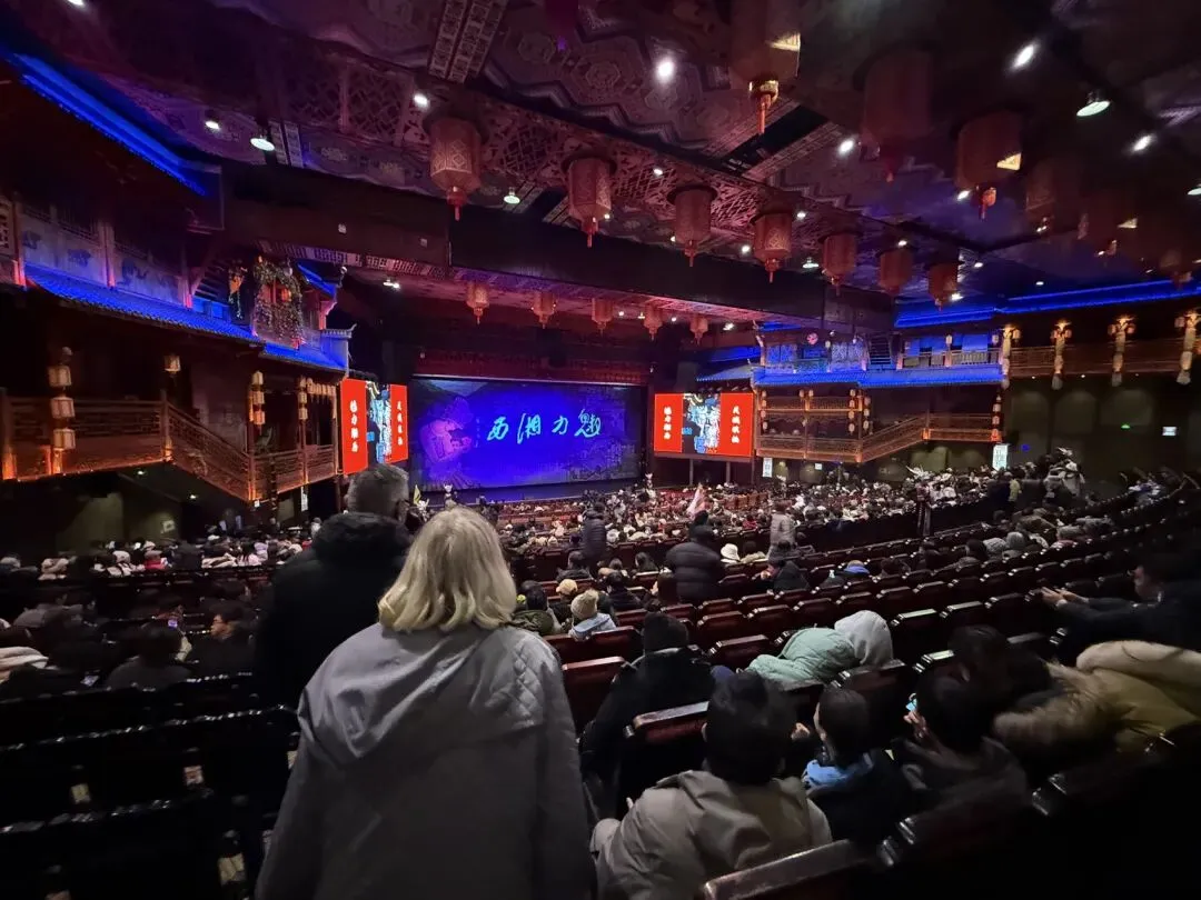 下山后,晚上的时间安排给了《魅力湘西》。剧场题字居然是黄永玉所写,好奇搜了下,他竟是湘西人。看完《魅力湘西》的演出,又觉得这片活力而神秘的土地,孕育出黄永玉这样的艺术家不足为奇。《魅力湘西》像是一台浓缩的民族晚会,通过杂技、舞蹈、山歌等多种形式展现了湘西多民族聚集地特有的哭婚、赶尸等习俗,整体还蛮有意思的,外场还短暂有一个小小的祭祀活动。外场其实有些活动看起来有点残忍,比如飞刀、走刀、下火海。有个很有意思的现象是,在主持人热场问大家想不想看的时候,很多人都不忍演员受此辛苦,频频摇头。