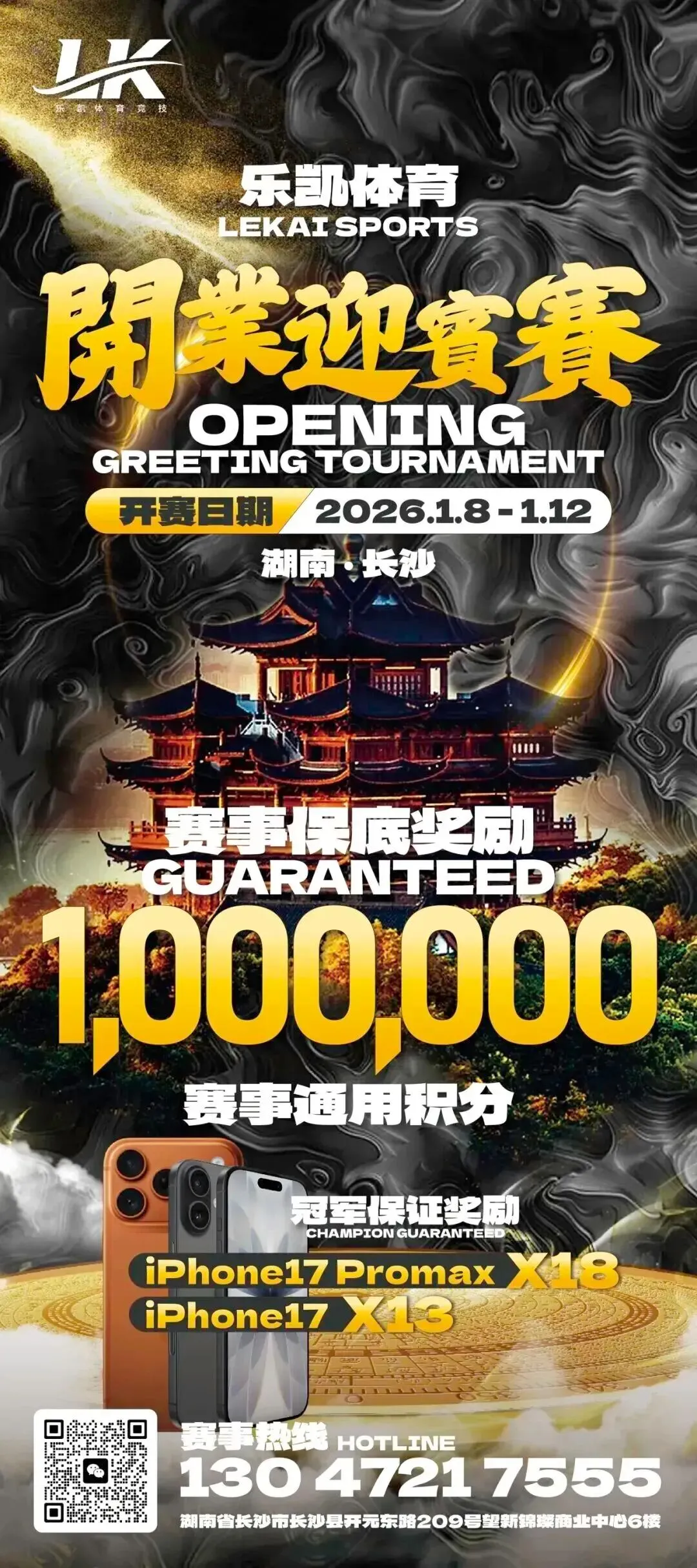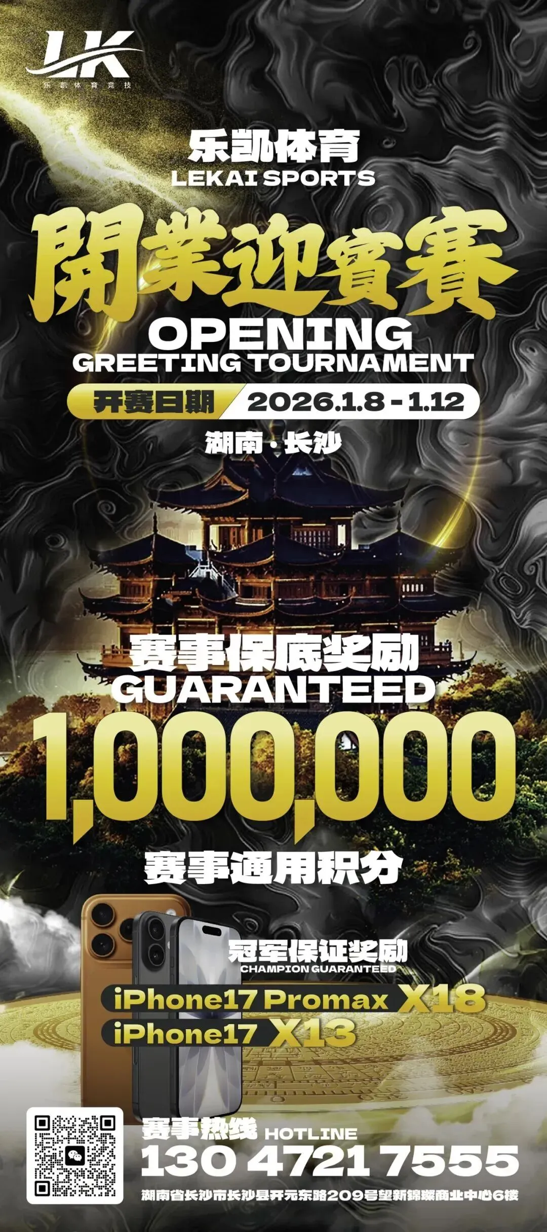 辞旧迎新,福利炸场!2026年1月3日-12日,乐凯体育将举办盛大开业系列赛,规格之高,奖励之壕,堪称业界之最!主赛事开业迎宾赛保底奖励高达100W赛事通用积分,冠军保证奖励31部iPhone17!