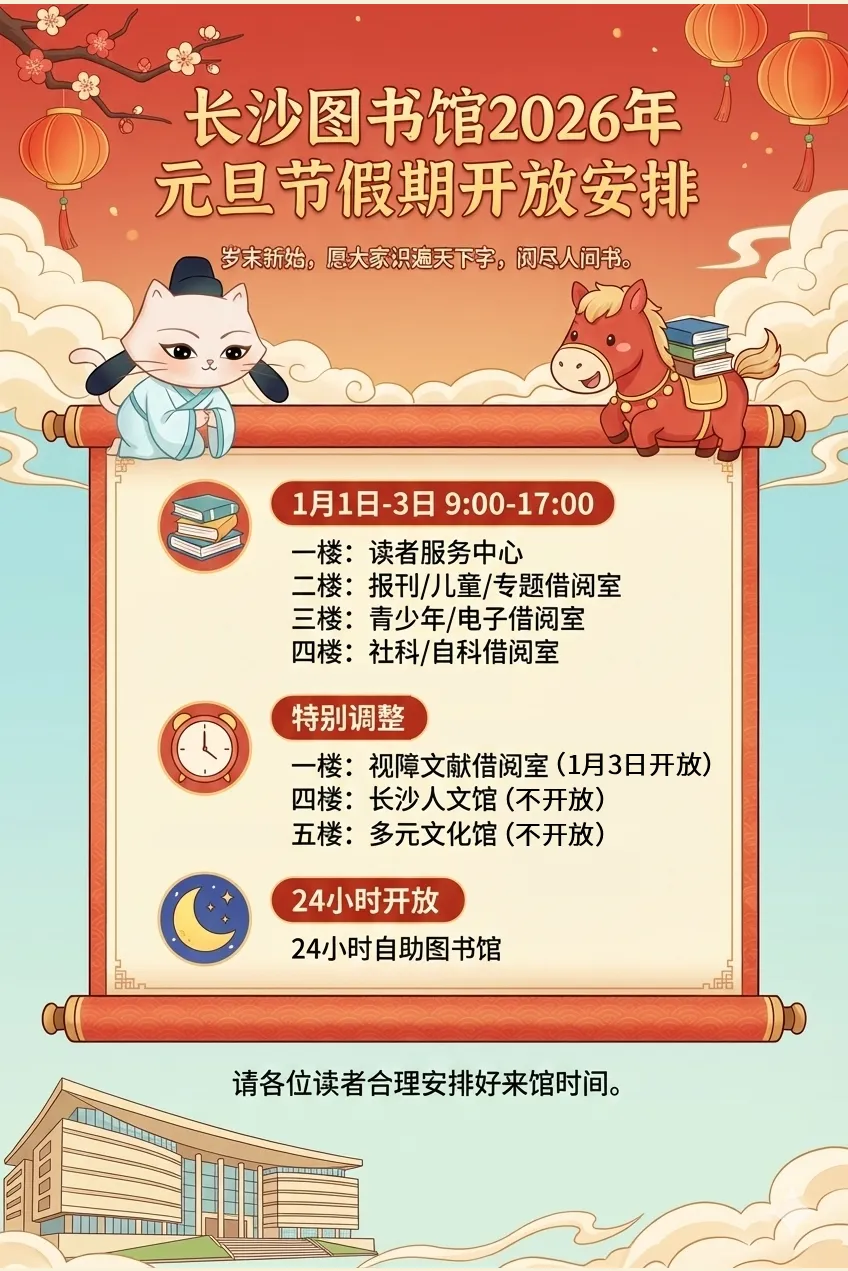 书香溢星城,阅读润汝心。为了方便读者来馆阅读学习,结合滨江文化园开放公告,我馆2026年元旦节假期开放安排具体如上。1月6日(周一)正常闭馆,请大家留意出行计划。
