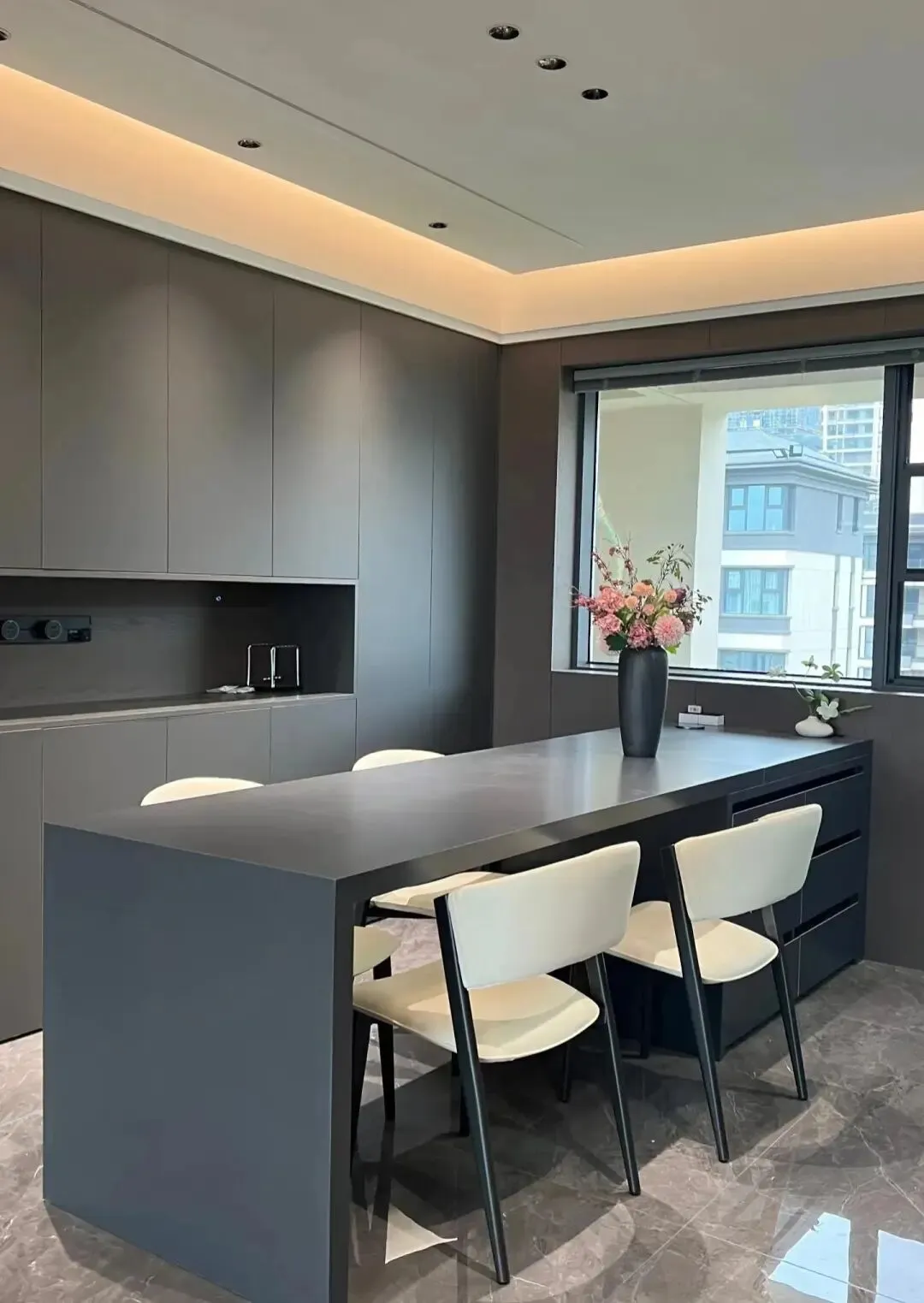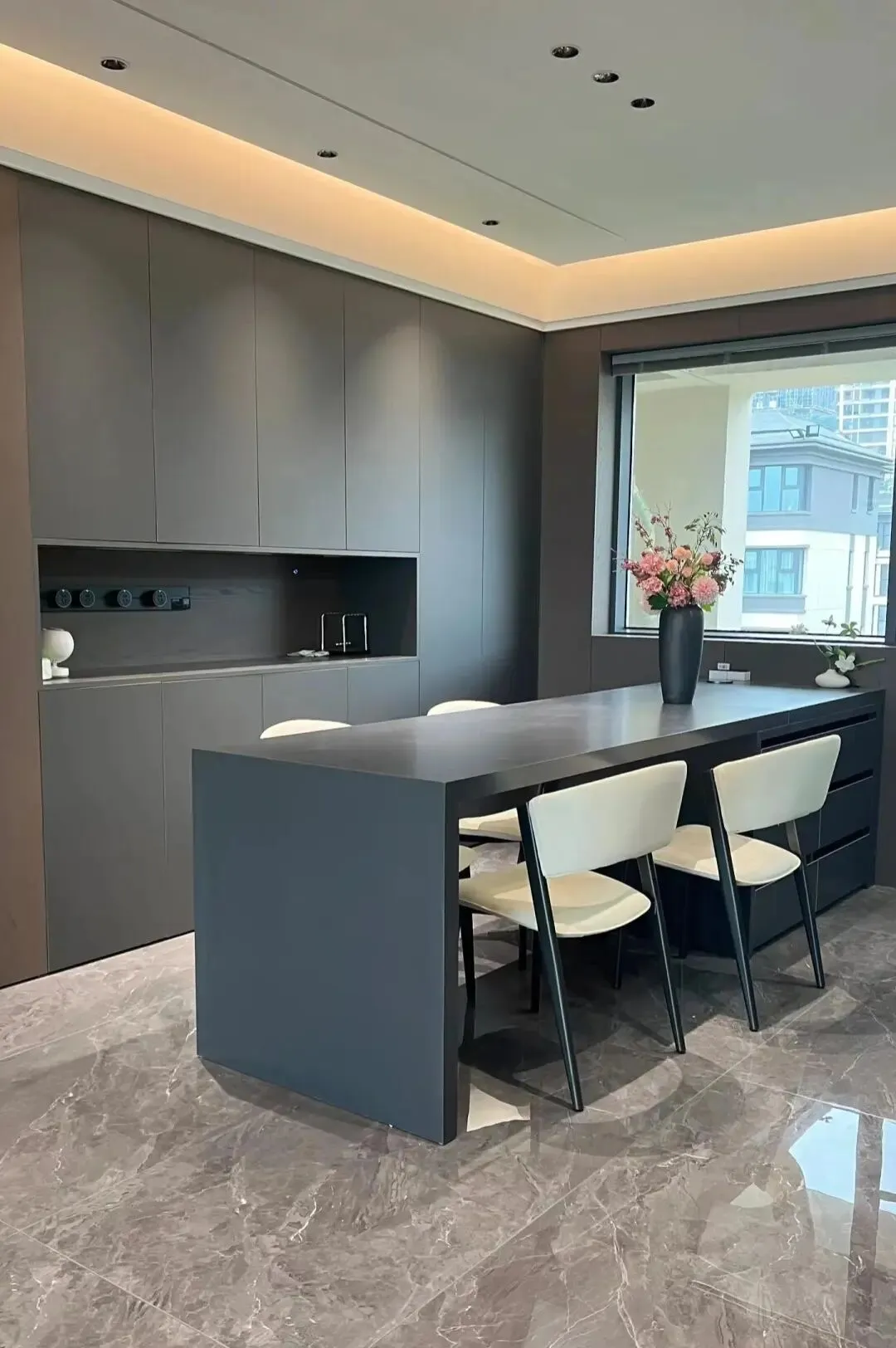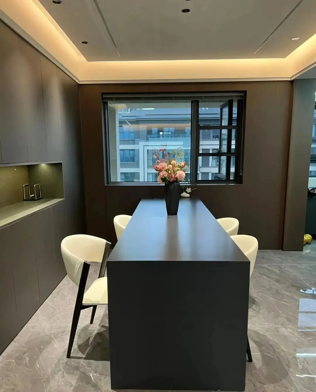 餐厅空间餐台石材定制的,很大气上档次!侧边设计到顶餐边柜!中间镂空设计,上方悬浮顶设计!四周灯带!中间防炫射灯!