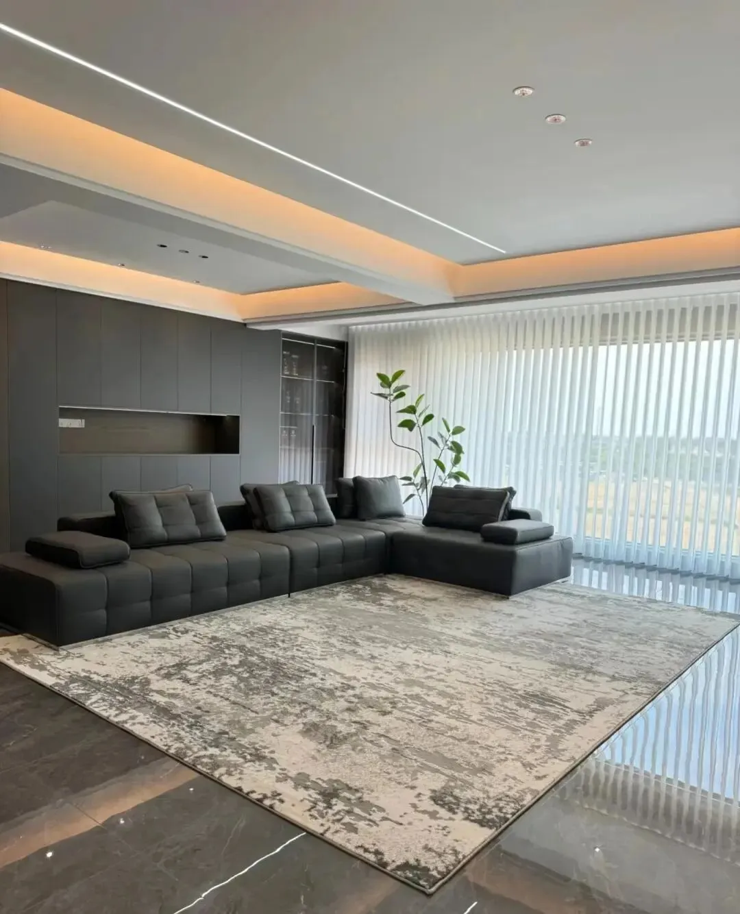 沙发选择深色皮质沙发,搭配灰色地毯,旁边搭配绿植,地面通铺灰色亮面瓷砖,整体看着很舒服!记住美缝要用同色的!