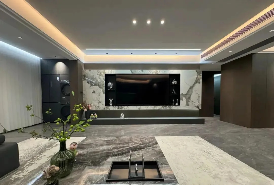 客厅空间电视背景墙造型简洁大气,岩板+木饰面+不锈钢隔层,电视内嵌,底部搭配落地深色电视柜!