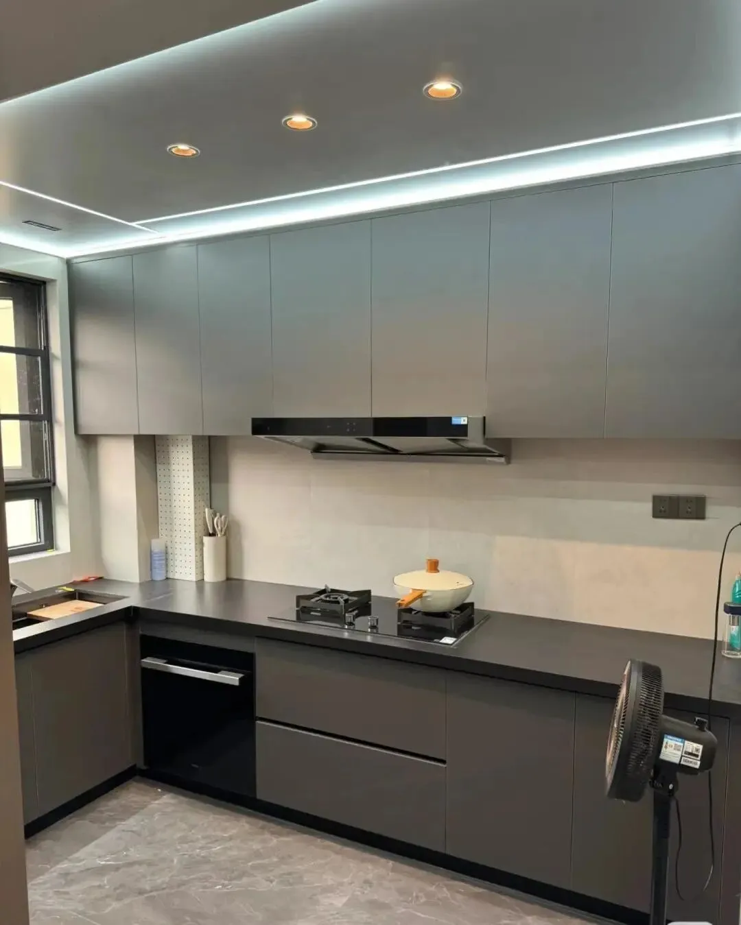 厨房区域橱柜U型布局设计,橱柜柜门深灰色平板门,台面深色!水槽台下盆工艺,洗切炒安排合理!顶上蜂窝大板吊顶!简约时尚!