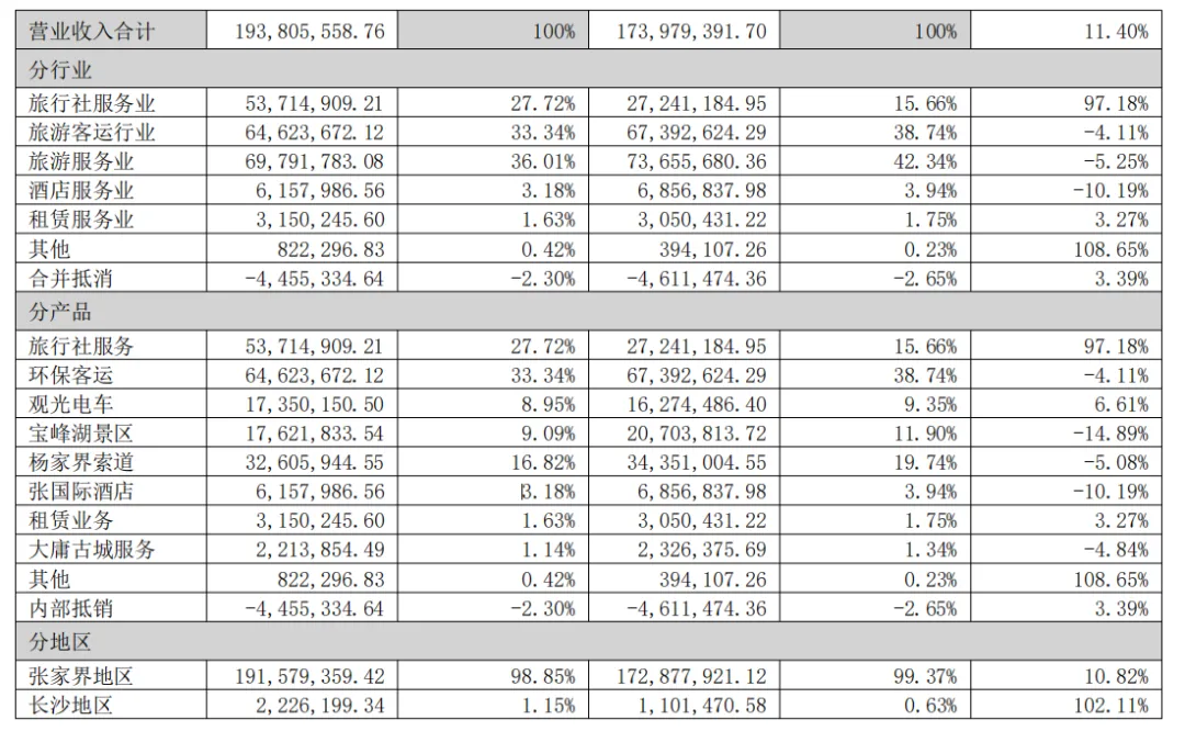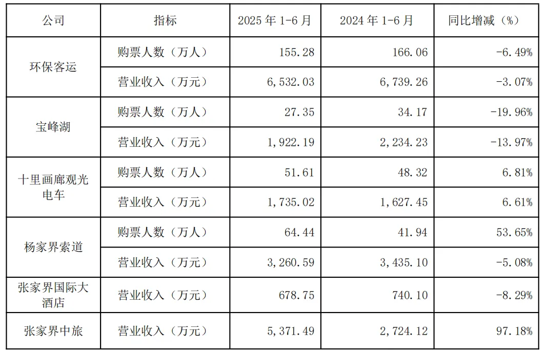 上市公司张家界业务:(1)旅游景区经营;(2)旅游客运;(3)旅行社经营;(4)旅游客运索道经营;(5)其他:酒店经营、房屋租赁等。旅游景区包括宝峰湖、大庸古城,旅游客运包括环保客运、观光电车,旅行社包括张家界中旅,旅游客运索道包括杨家界索道,酒店包括张国际酒店。