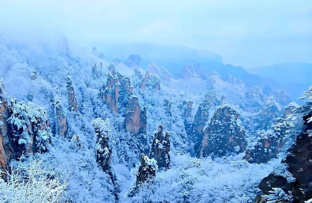 从森林公园的峰林,到天门山的玻璃栈道,再到七星山的云端,雪花簌簌飘落在每一道奇峰与险壑,显露出柔和且磅礴的美感。