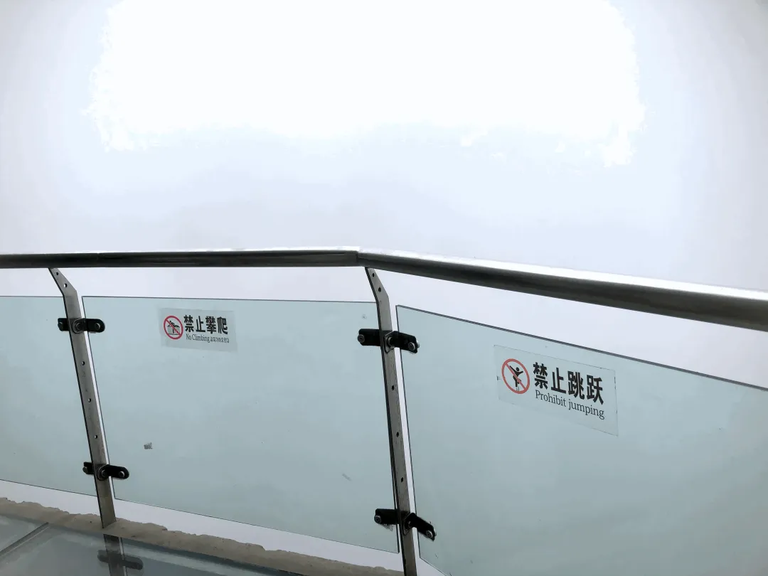 玻璃护栏上写着“禁止攀爬”“禁止跳跃”