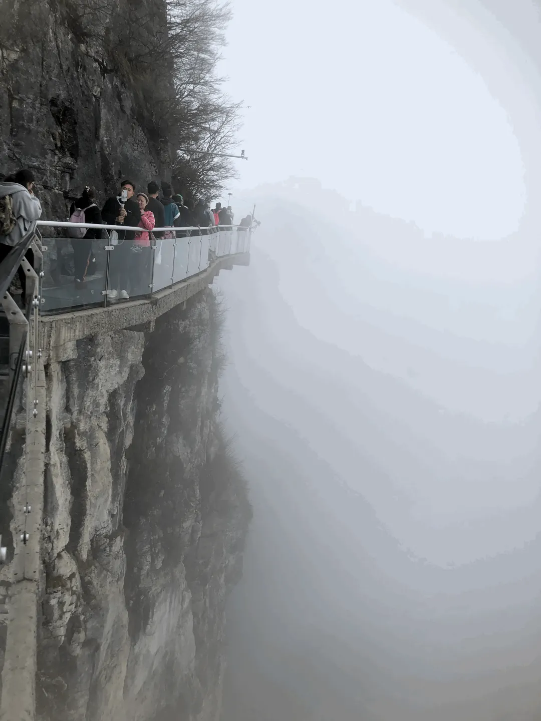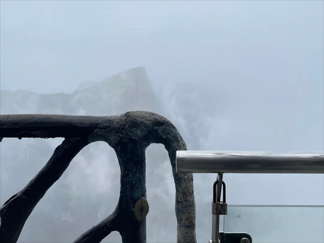 护栏上的安全提示从玻璃栈道往外看,天门山的风景尽收眼底。玻璃栈道之下就是深崖,深崖底部林木丰茂,云雾缭绕。