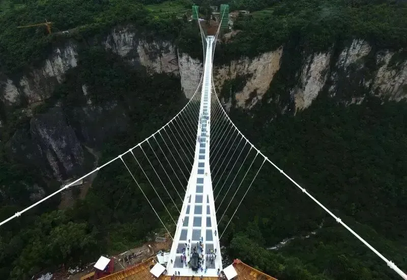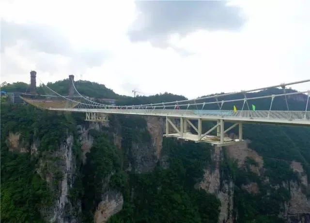 张家界大峡谷玻璃桥从立项到概念设计,再到施工完成前后共耗时九年,期间经过近百次的防冻、防爆、防震等安全试验。每块桥面玻璃至少可承载60吨的压力。