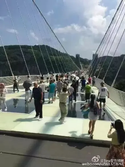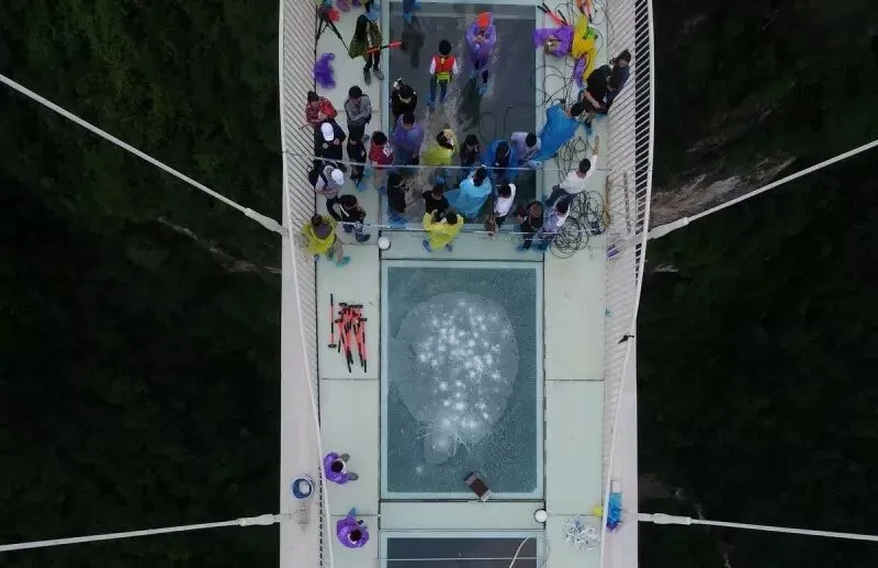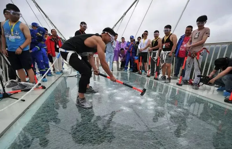 景区邀请了30位美女和壮汉,轮番用重达5.5公斤的铁锤向同一块桥面玻璃进行重击,并让重两吨的SUV在已被砸裂的玻璃桥面上通行。