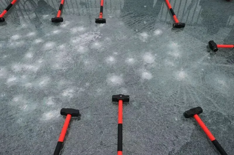 一百锤之后,精心挑选的十位肌肉型男上阵,只见他们抡起铁锤狠狠地向玻璃砸去,第一层玻璃完全碎裂,用手稍微用力就能抠出不少玻璃渣子。随后,第二层玻璃在重击下也迅速开裂。