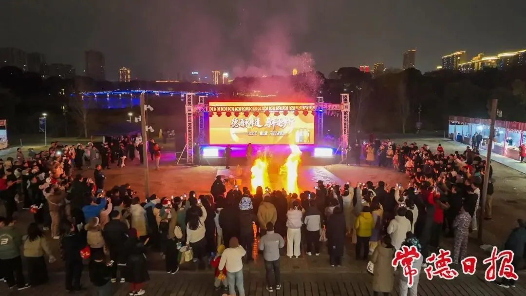 元旦节当晚,“德山酒元旦之夜”专场活动以一场炽热的非遗表演,点燃了2026年的第一把“火”。惊险的火壶舞、绚烂的喷火技艺、灵动穿梭的鱼灯……这些传统技艺在夜幕下交织升腾,将红红火火、兴旺吉祥的美好祝愿,传递给现场的每一位游客。