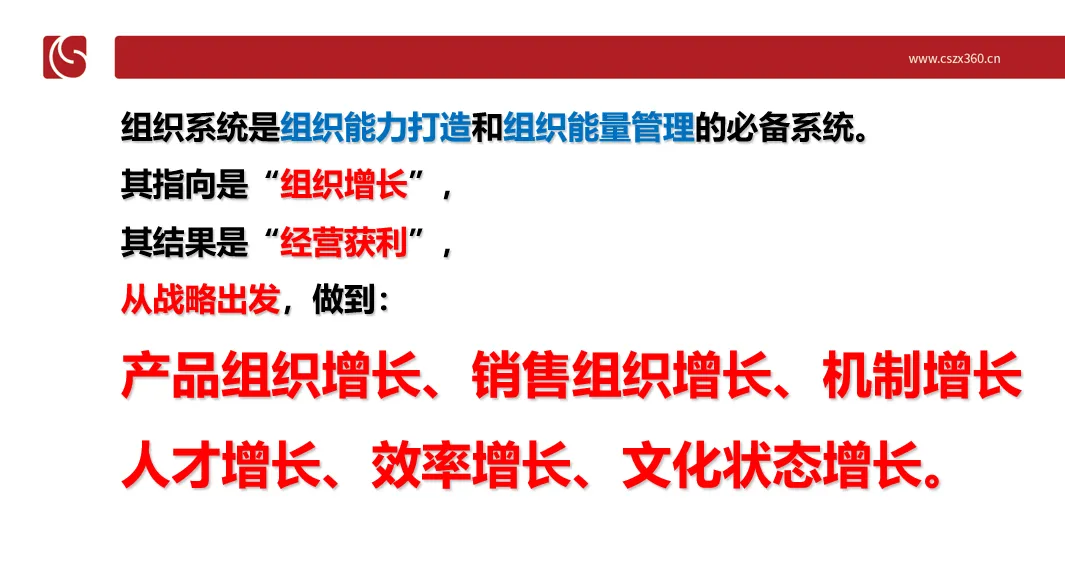 组织系统:是从战略出发和从人的方面着手,为企业实现增长目标、梳理升级打造企业的股权顶层设计、企业战略目标、经营流程、组织架构、工作分析、薪酬设计、绩效考核、经营分析、招聘管理、培训体系、职业生涯规划等,让企业管理系统自循环。目的是:管好人、用好人、激活人,让企业系统托管解放老板!