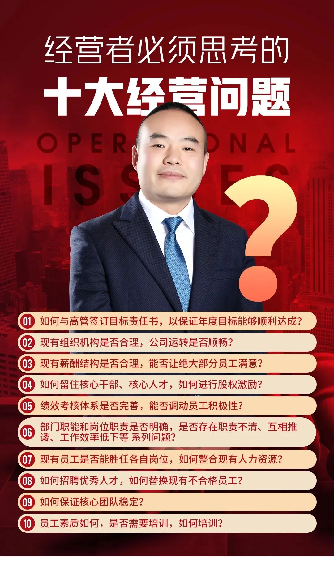 建立一支有战斗力的企业团队,老板不能凭一己之力!更要学会依靠团队、依靠系统的力量!将成型的业务流程教给员工、将成体系的管理制度导入团队、用操盘的思维去经营企业!把自己从企业中解放出来,老板才能站在更高的层次去与市场博弈!