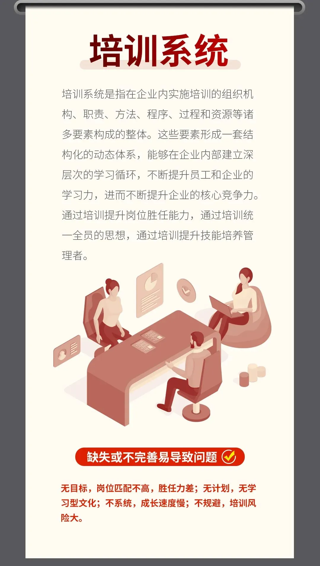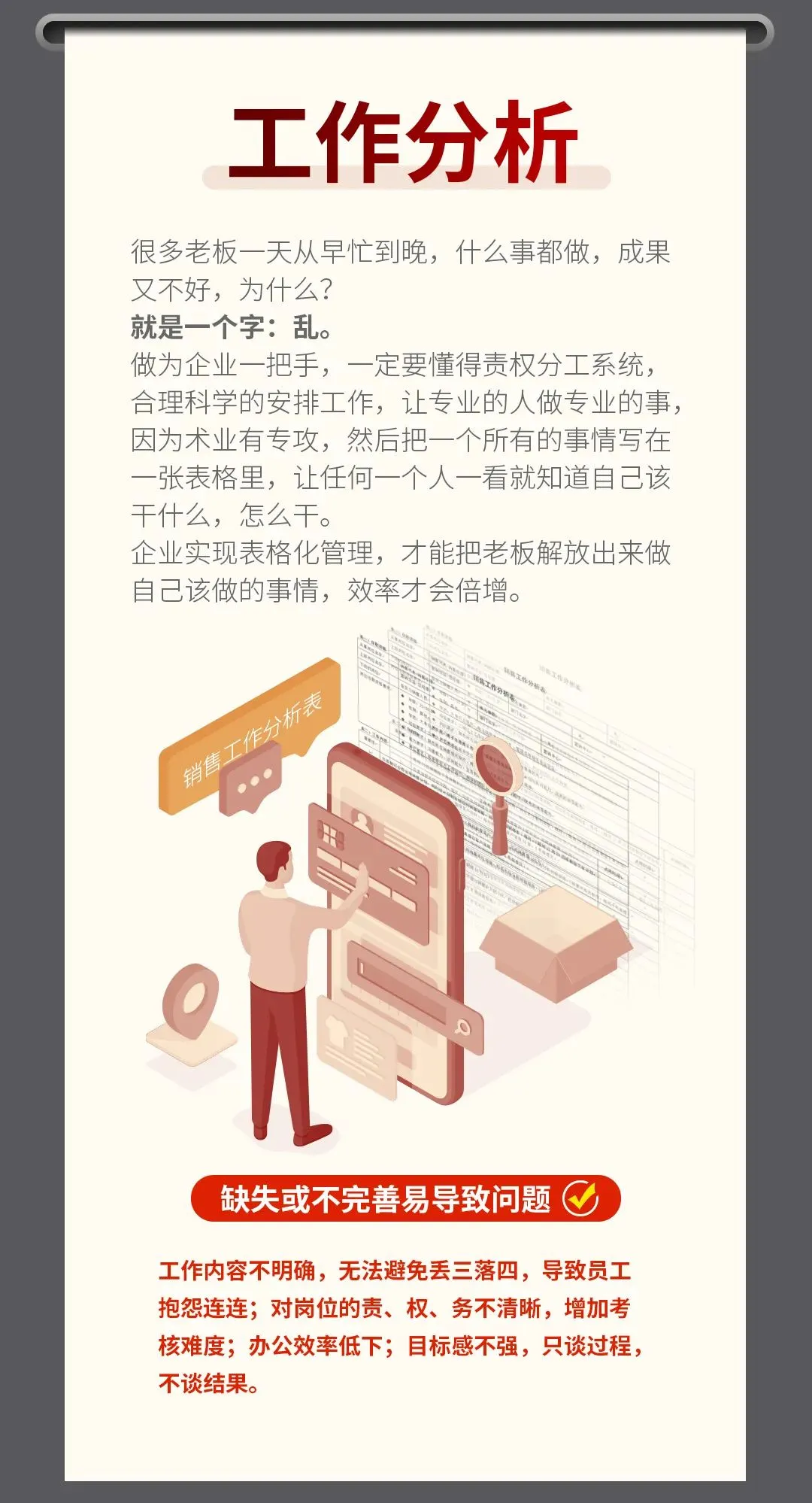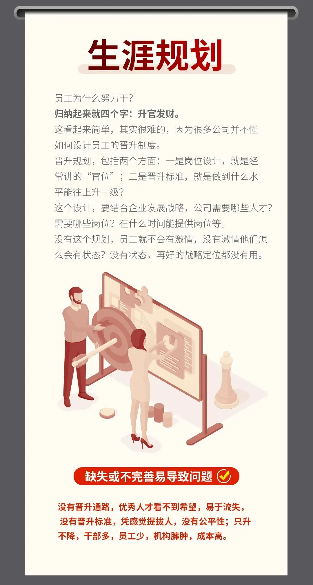 不仅要建立一套完善的工作分析体系,还要建立绩效考核制度,对员工胜任力进行评价和量化,还要将薪酬设计以及晋升考核与结果挂钩,也就是薪、晋、考、三维一体。公司管理靠人来管人非常难,用机制来驱动人,激活人,各司其职管理将变得高效有结果!