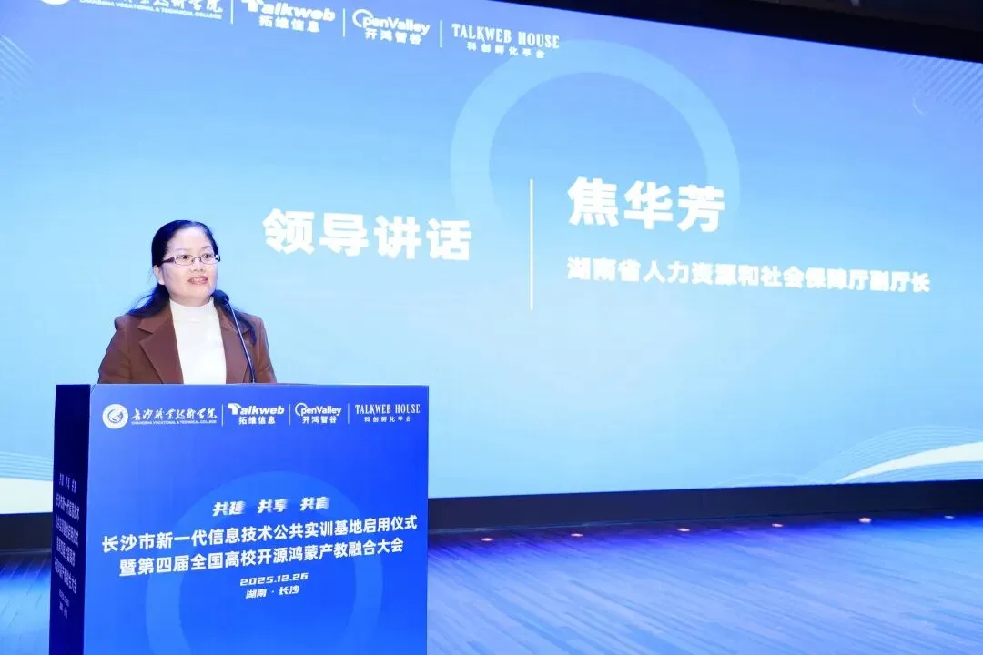 湖南省人力资源和社会保障厅副厅长焦华芳在讲话中指出,建设长沙市新一代信息技术公共实训基地是湖南省响应国家战略、推动关键核心技术人才培养的重要举措。她强调,基地以开源鸿蒙等自主根技术为培养方向,聚焦数字经济时代对高技能人才的迫切需求,展现了湖南在信息技术自主创新人才培养上的前瞻布局与责任担当。省人社厅将持续支持基地建设,为湖南打造国家重要先进制造业高地提供坚实的人才支撑。图/湖南省人力资源和社会保障厅副厅长 焦华芳现场讲话